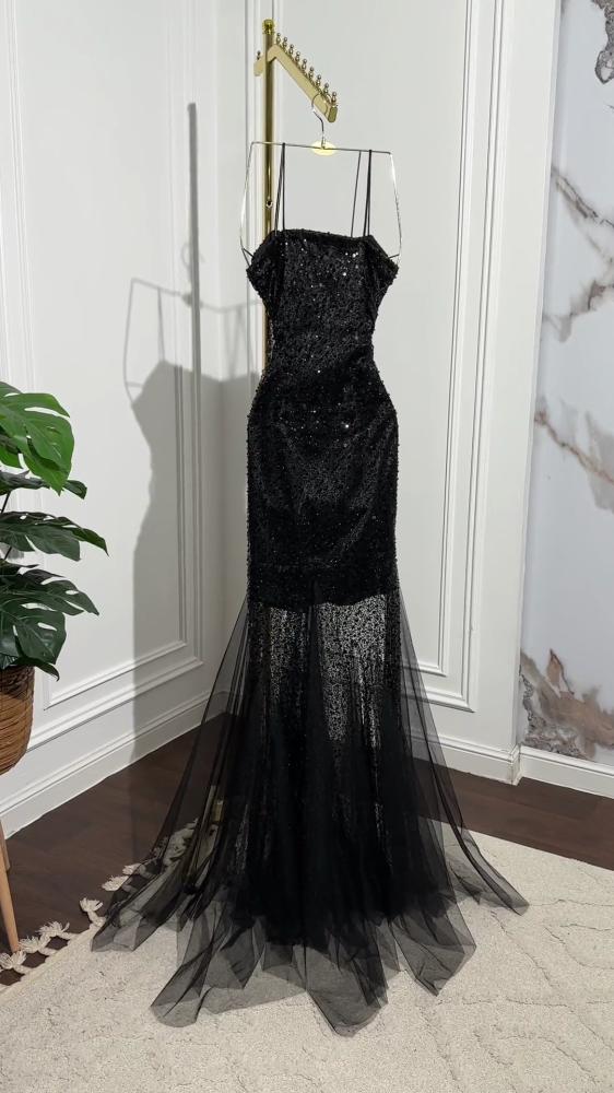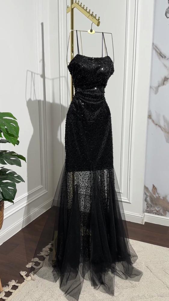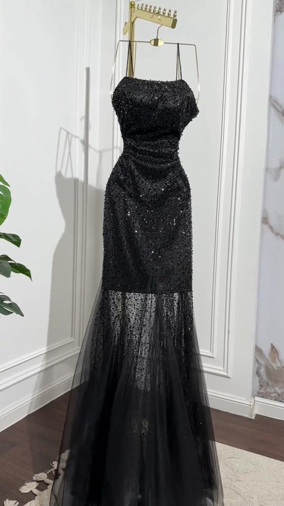 فستان سهرة قماش ترتر مع تل ناعم مع لؤلؤ