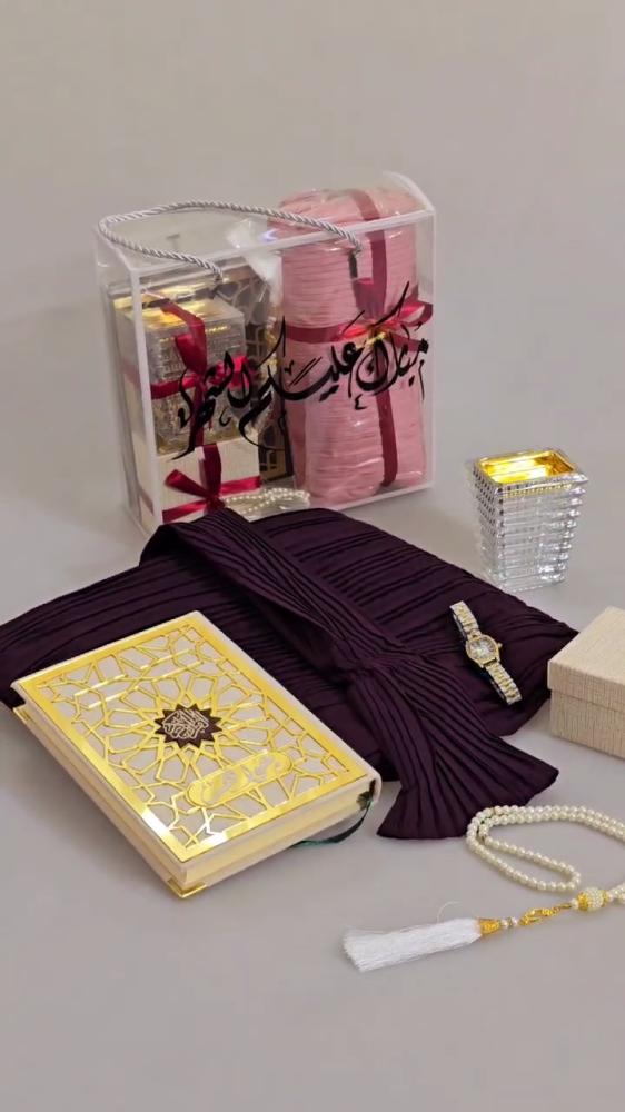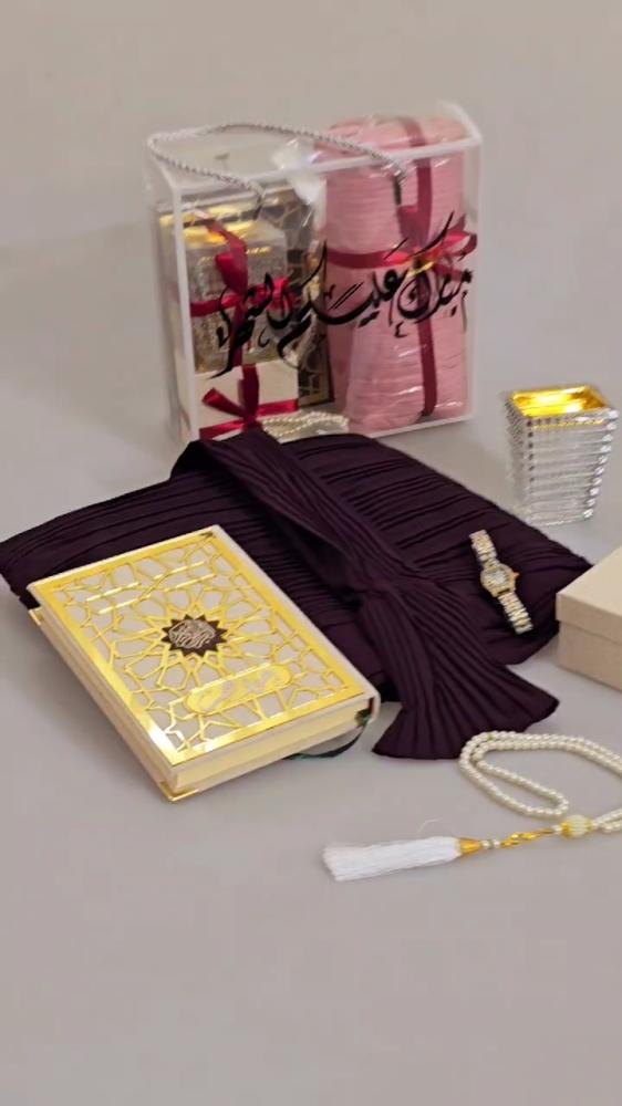 بكس صلاة مع سجادة ومصحف وشراشف الصلاه بالاسم