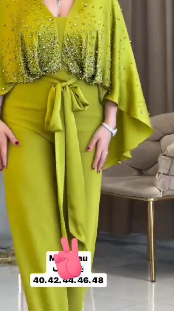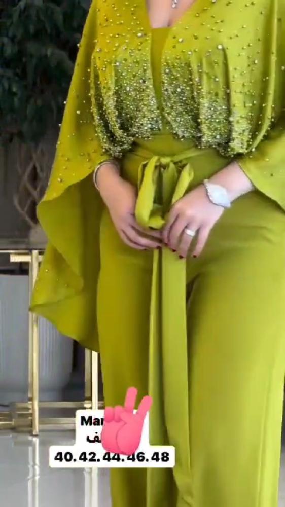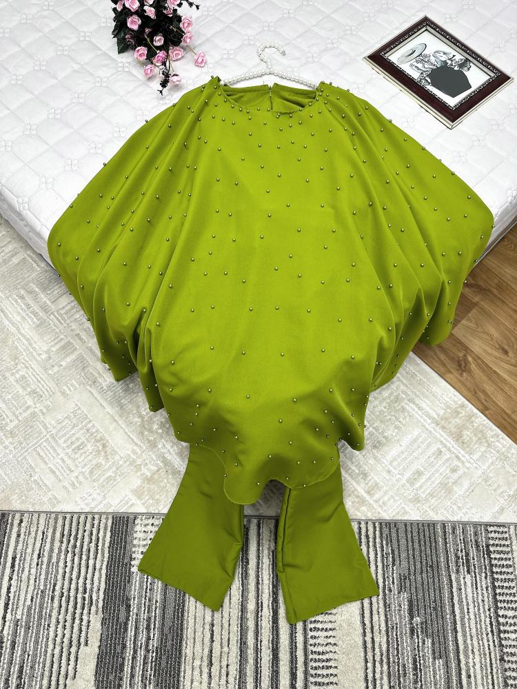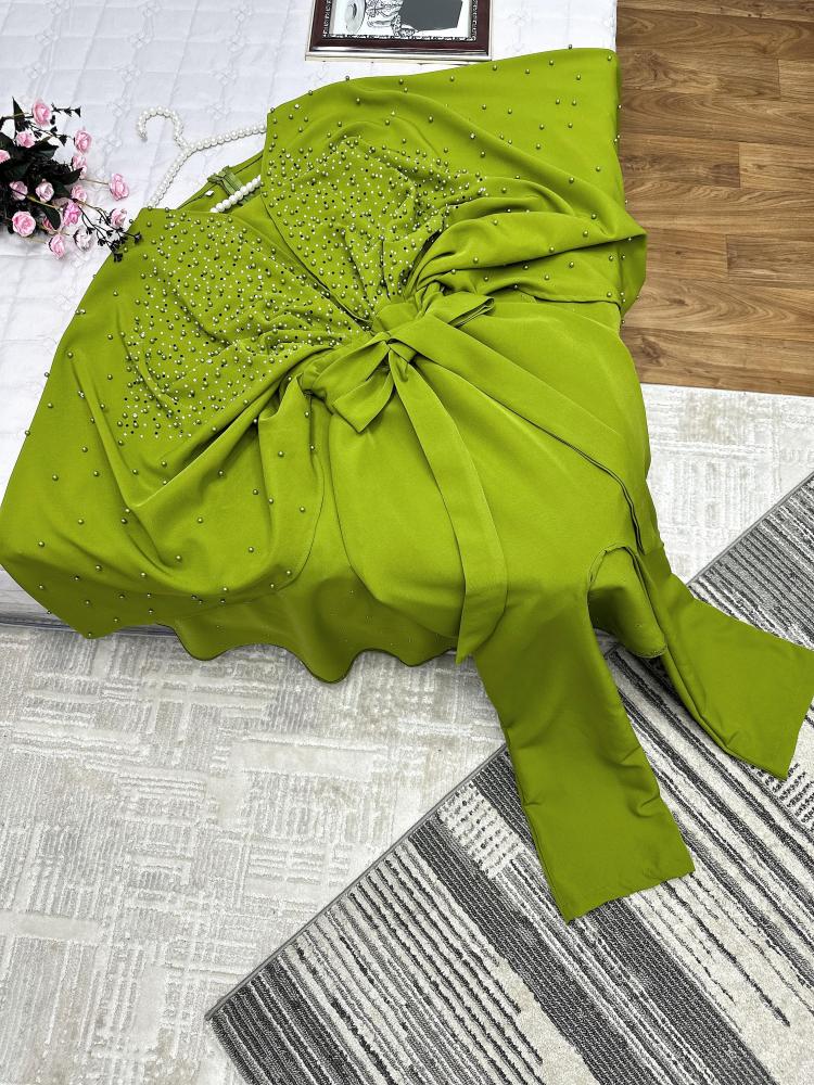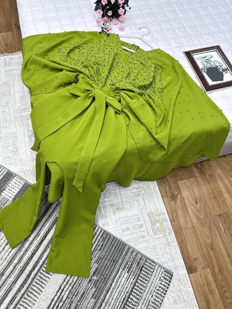 فستان نسائي فستقي خامه كريب استريتش تطريز