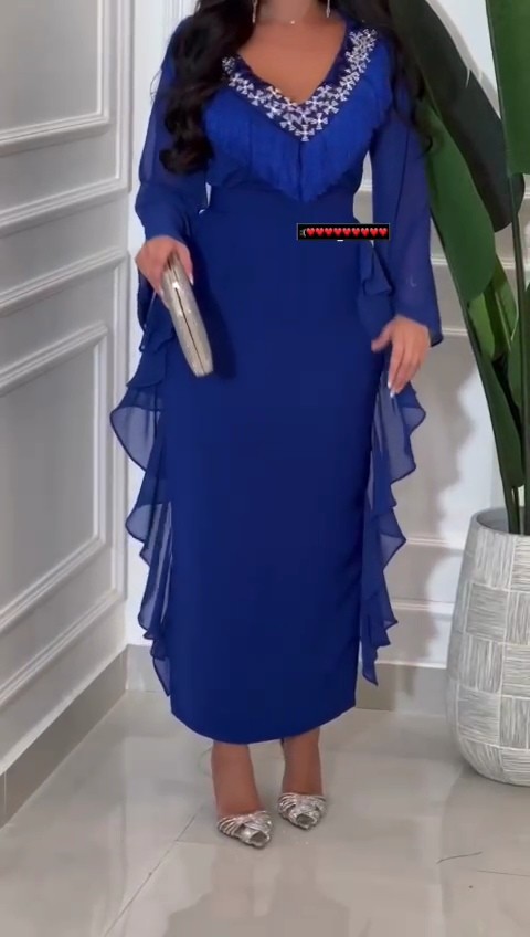 كريب استرتش + شيفون جورجيت + تطريز يدوي + هدب جهة الصدر