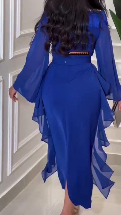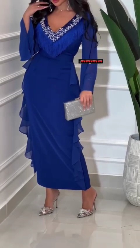 فستان نسائي سهرات طويل كريب استرتش + شيفون جورجيت + تطريز يدوي + هدب جهة الصدر