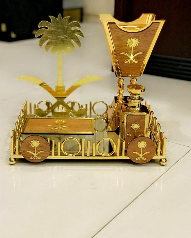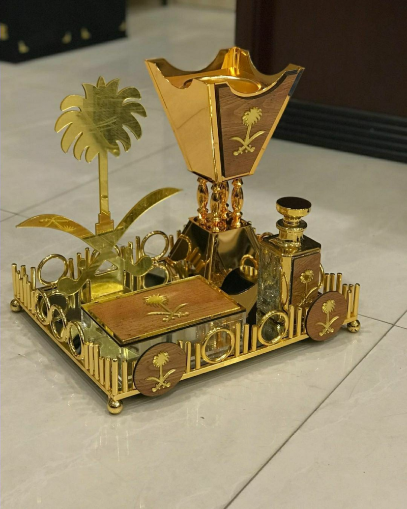 • يتكون الطقم من {مبخره بالاسم مع تعليقتها + بوكس العود + توله العطر + استاند خلفي بشكل سيفين ونخله + الصينيه الملكيه}