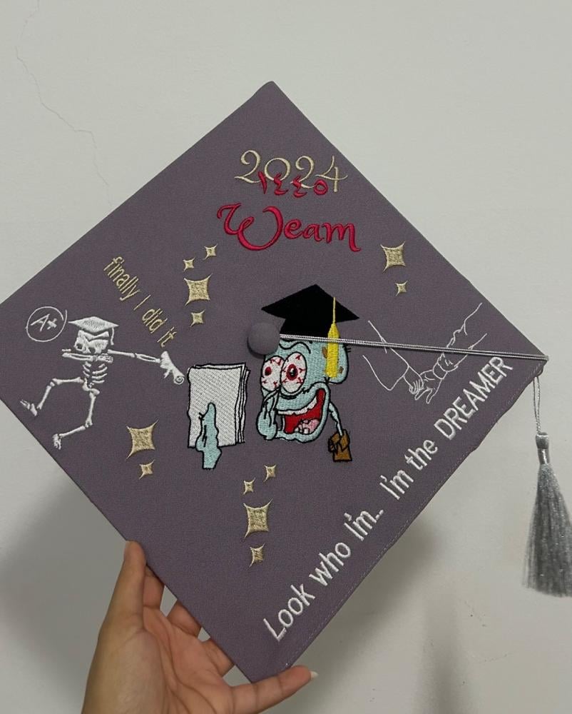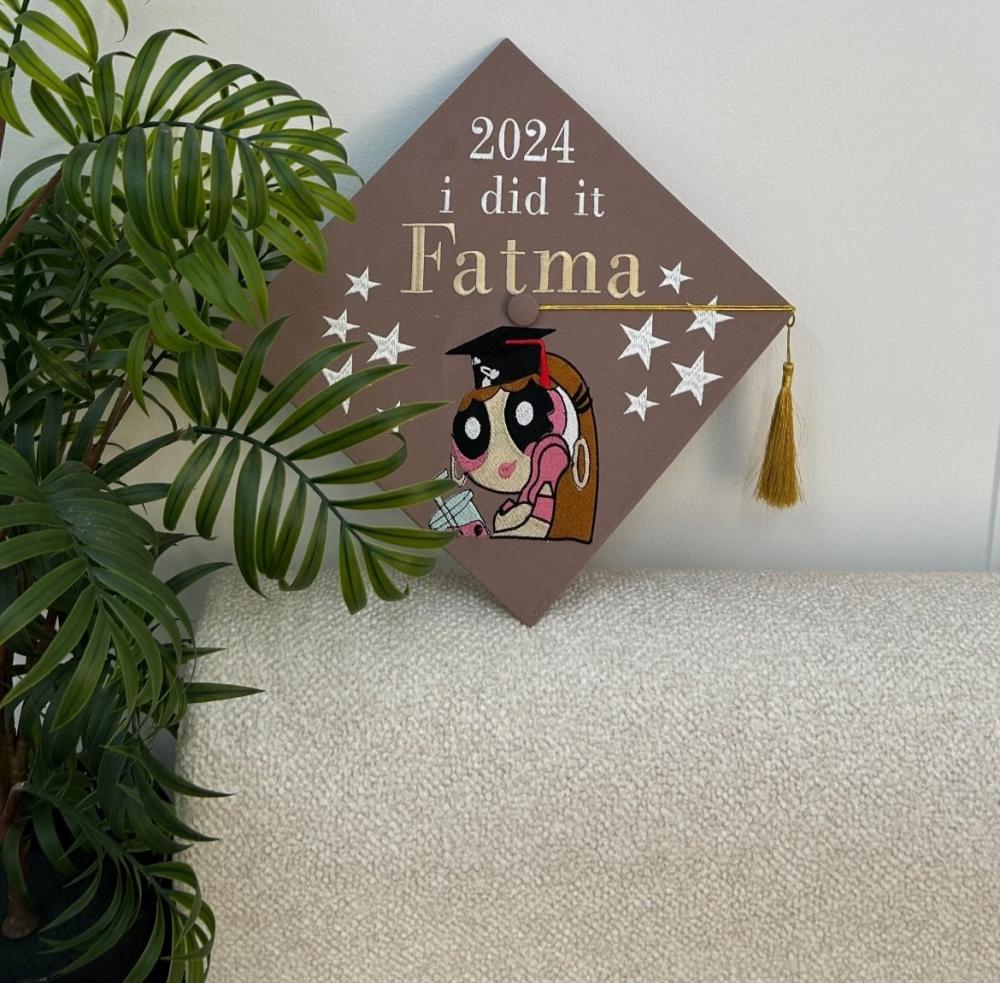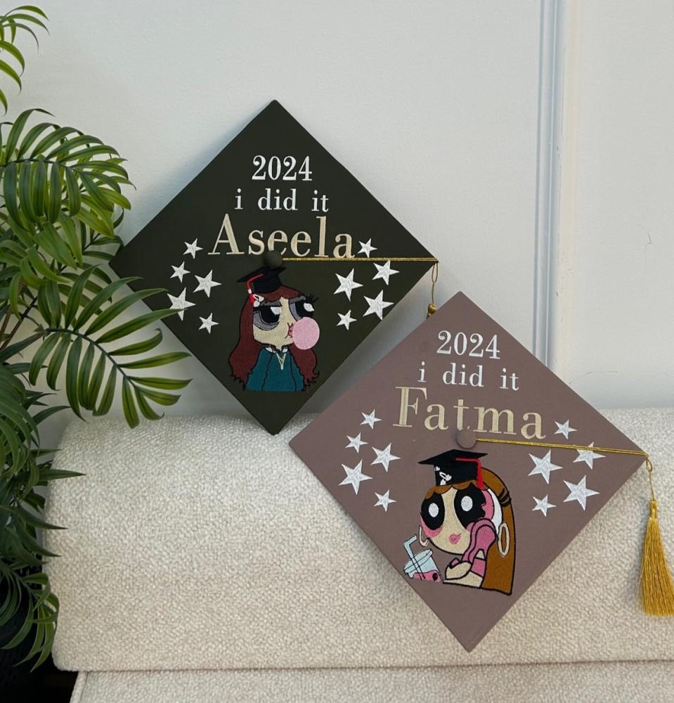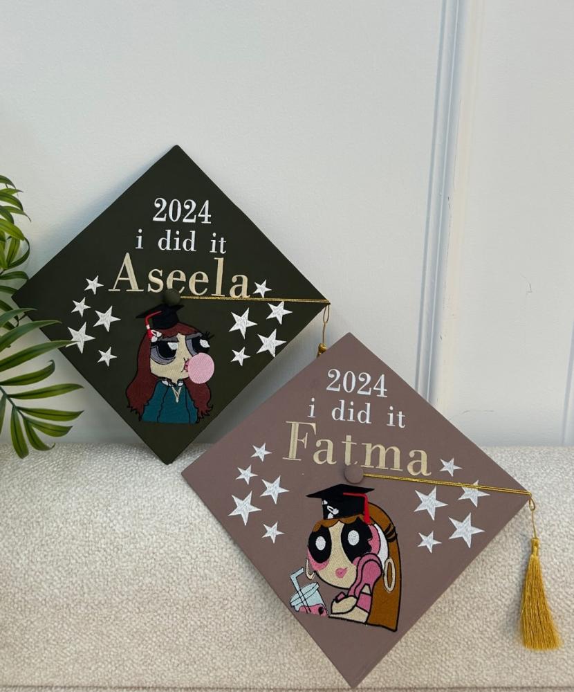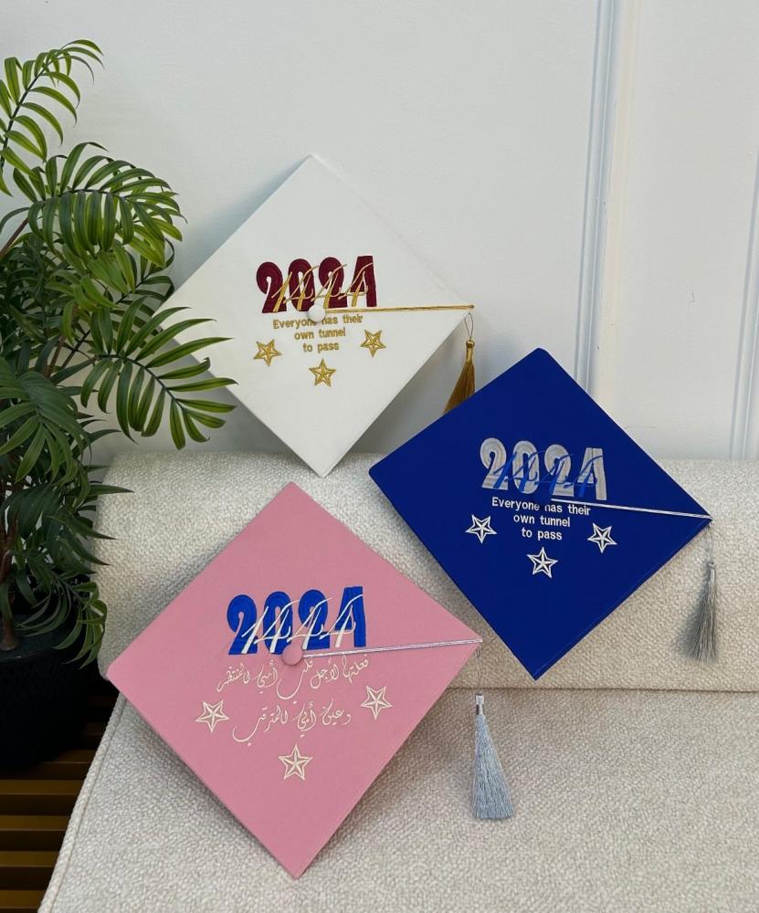 قبعه تخرج تطريز بالاسم والعبارة وسنة التخرج وشعار الدفعة