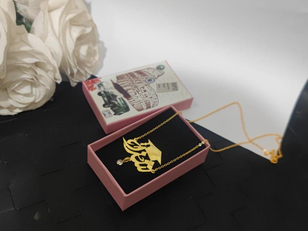 مطلي بالذهب عيار 21 قيراط.يمكنك تخصيص أي اسم أو كلمة (عربي أو إنجليزي).متوفر طلاء ذهبي أو فضي (روديوم).ضمان سنتين على اللون من لافيولا.سمك 0.7 مم.تأتي داخل علبة هدايا بسيطة وكيس عليها شعار لافيولا