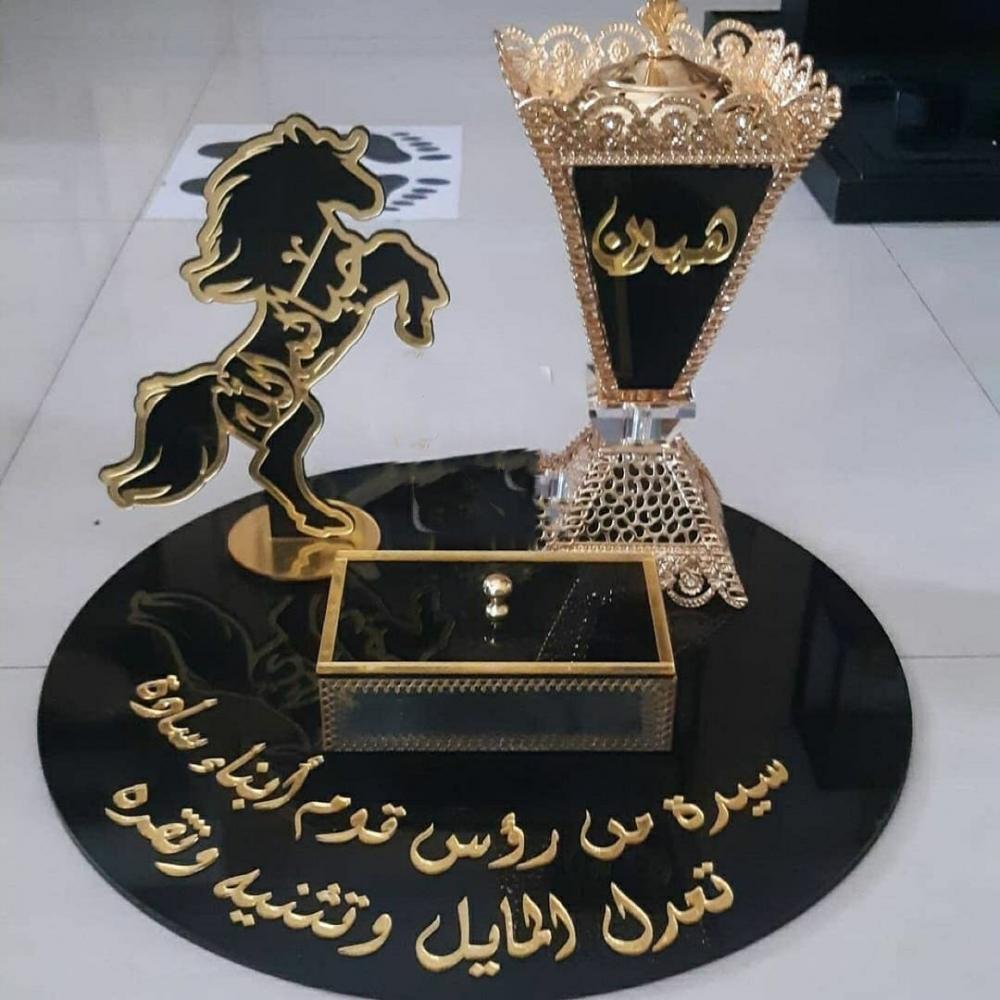 • يتكون الطقم من {مبخره بالاسم مع تعليقتها + بوكس العود + توله العطر + استاند خلفي بشكل سيفين ونخله + الصينيه الملكيه}