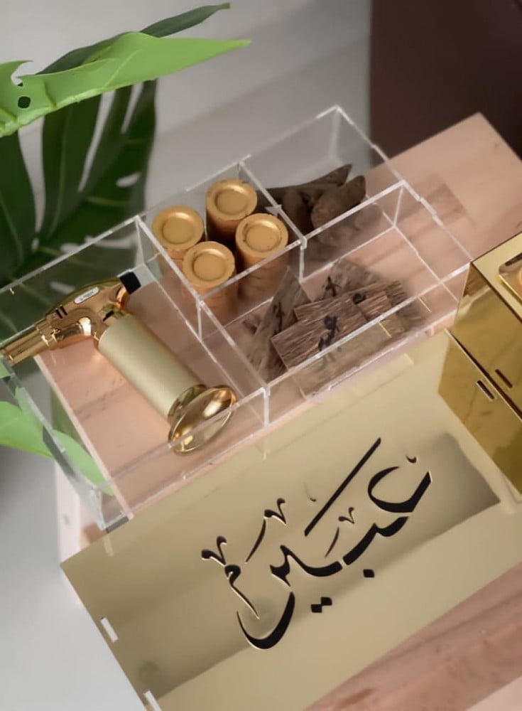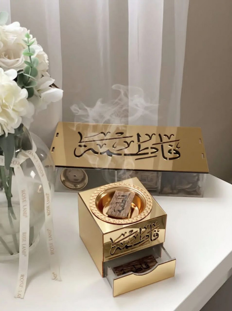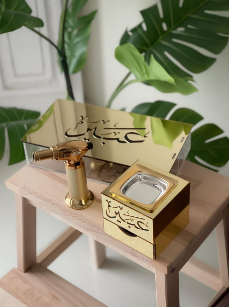 لم نكتفي فقط بالبخور و مستلزماته أضفنا مع هذا العرض الفاخر مبخرة مستوحاه من المرايا باللون الذهبي الفاخر تحمل اسمك او اسم من تحب.
