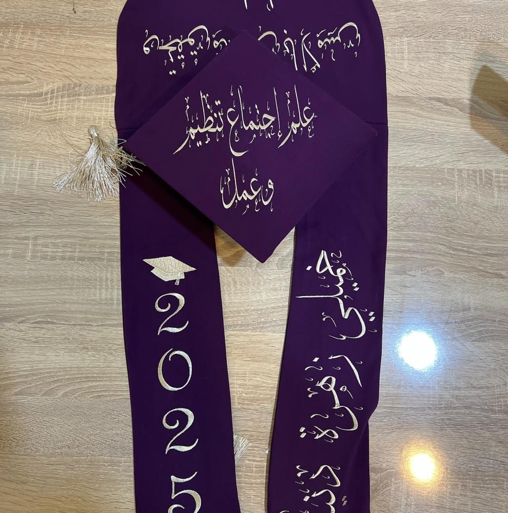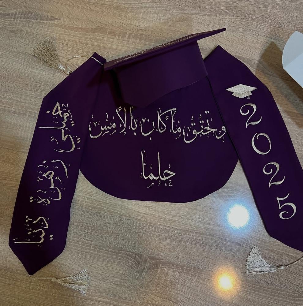 وشاح وقبعه تخرج مخمل او ستان بالاسم والعبارة وسنة التخرج وشعار الدفعة 2025
