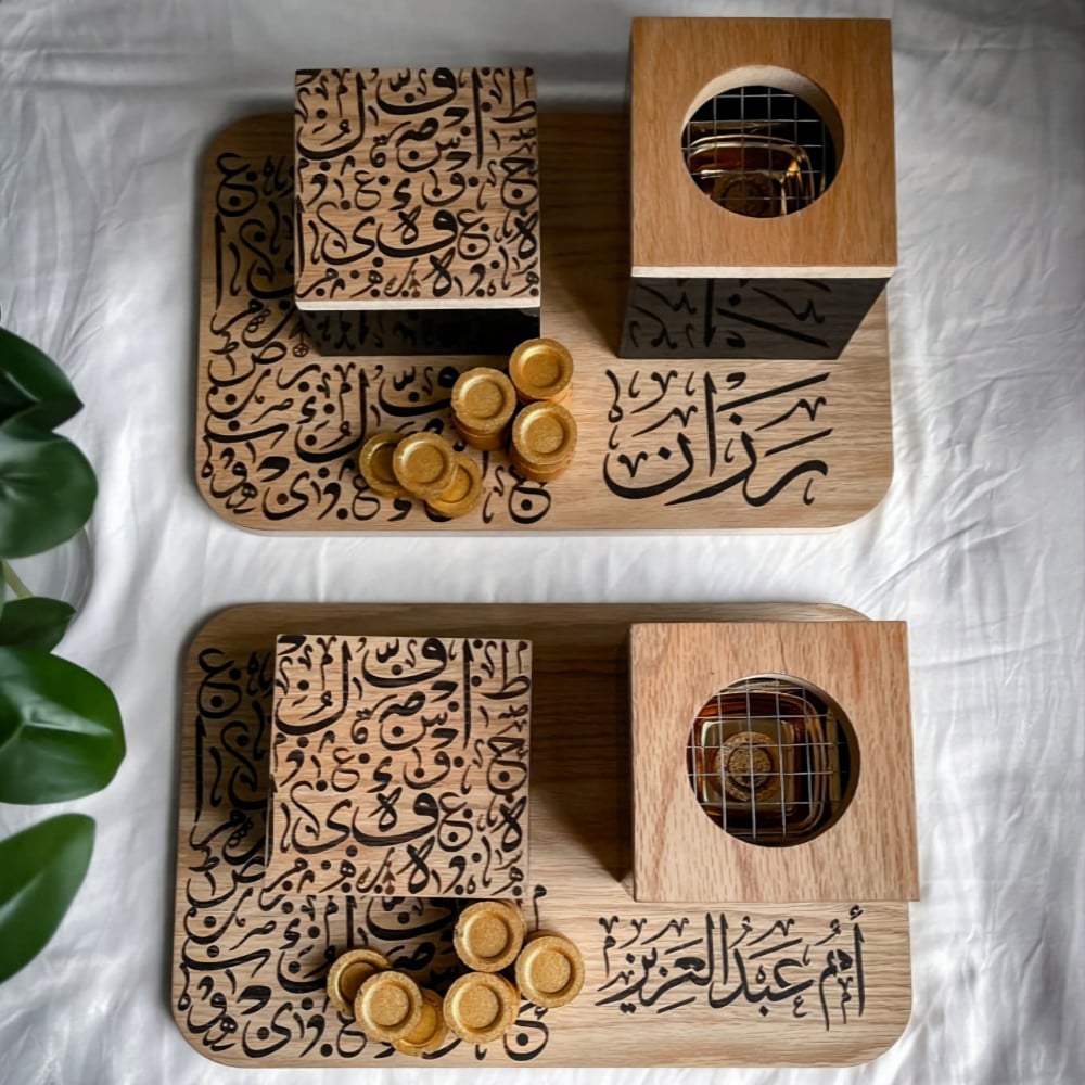 مبخرة الاحرف العربية طقم مبخرة خشبية مع صينية وعلبة عود