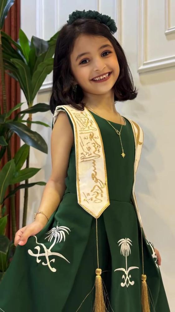 فستان وطني بناتي لليوم الوطني قماش كريب مع سدو مع وشاح ستان