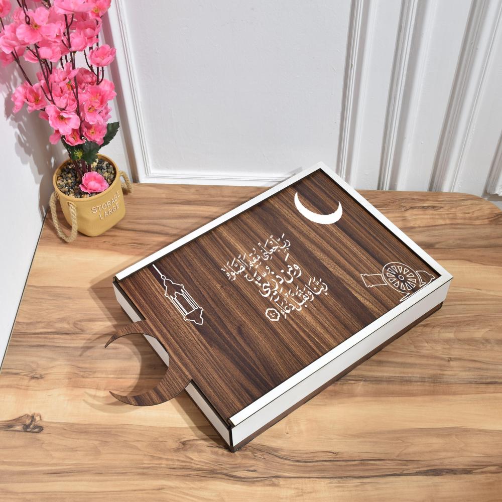 ** تقدم لكم *بوكس رمضاني فاخر* مصنوع من الخشب، يجمع بين الأناقة والروحانية في باقة واحدة لتضفي لمسة من الفخامة على أيامكم المباركة.