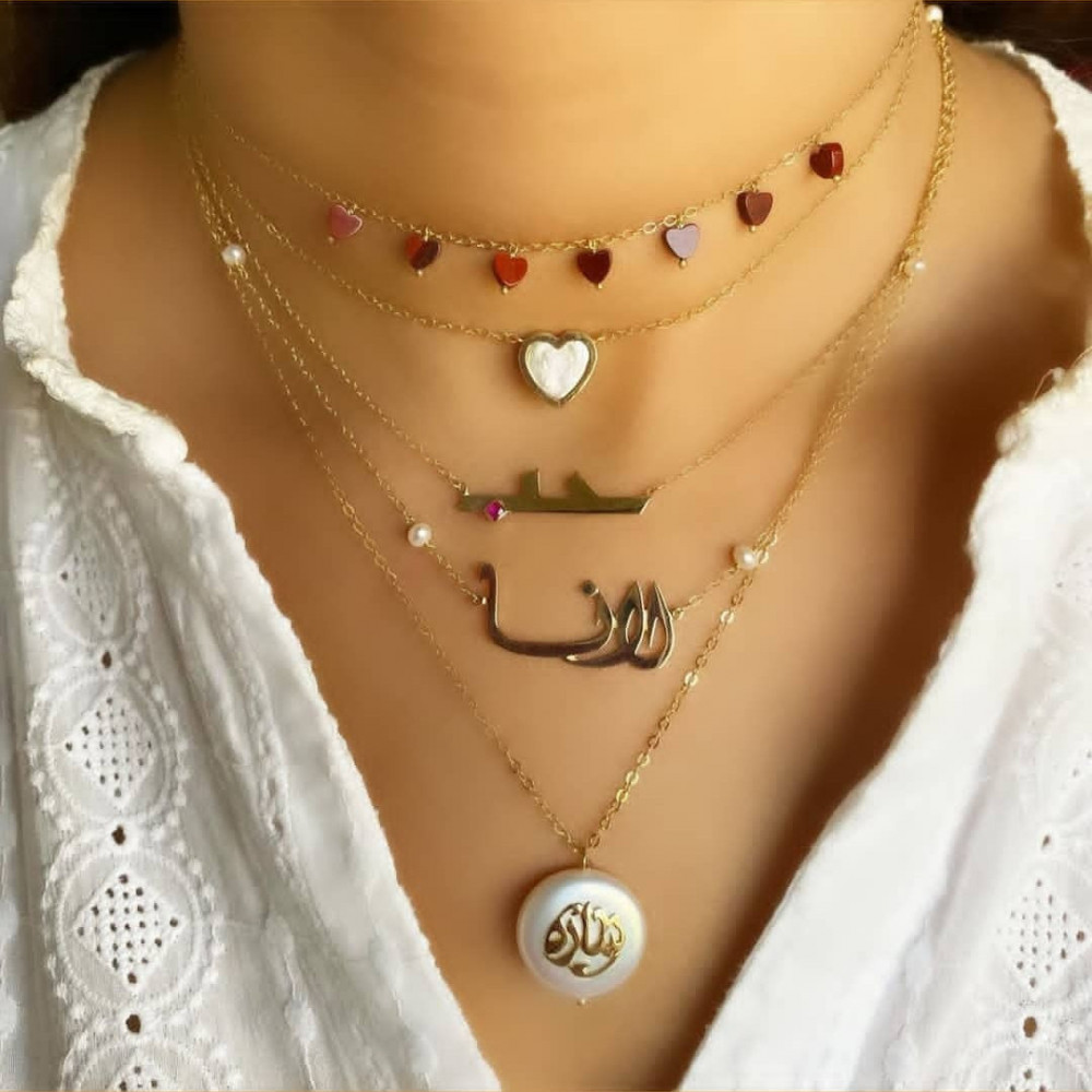 سلسلة بتصميم الاسم مع صدف افريقي ومع حجر كريم حسب الطلب اسم وبرج او حرف وبرج