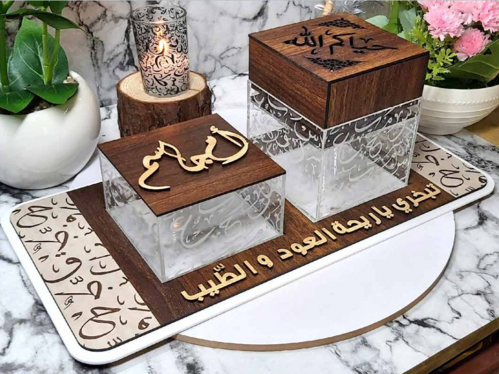 مبخرة الاحرف العربية طقم مبخرة خشبية مع صينية وعلبة عود