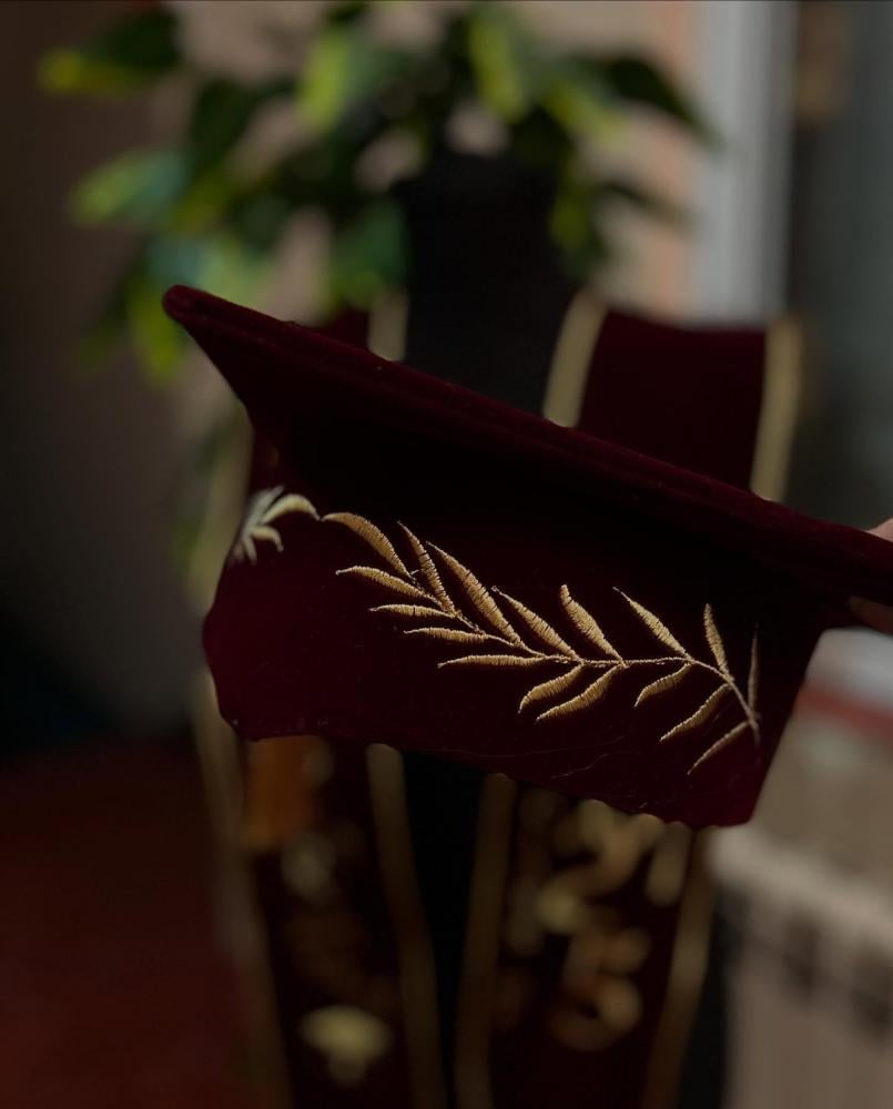 وشاح وقبعه تخرج مخمل ويتوفر كريب بالاسم والعبارة وسنة التخرج وشعار الدفعة 2025