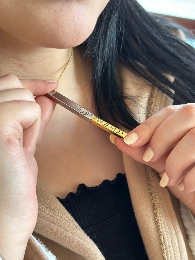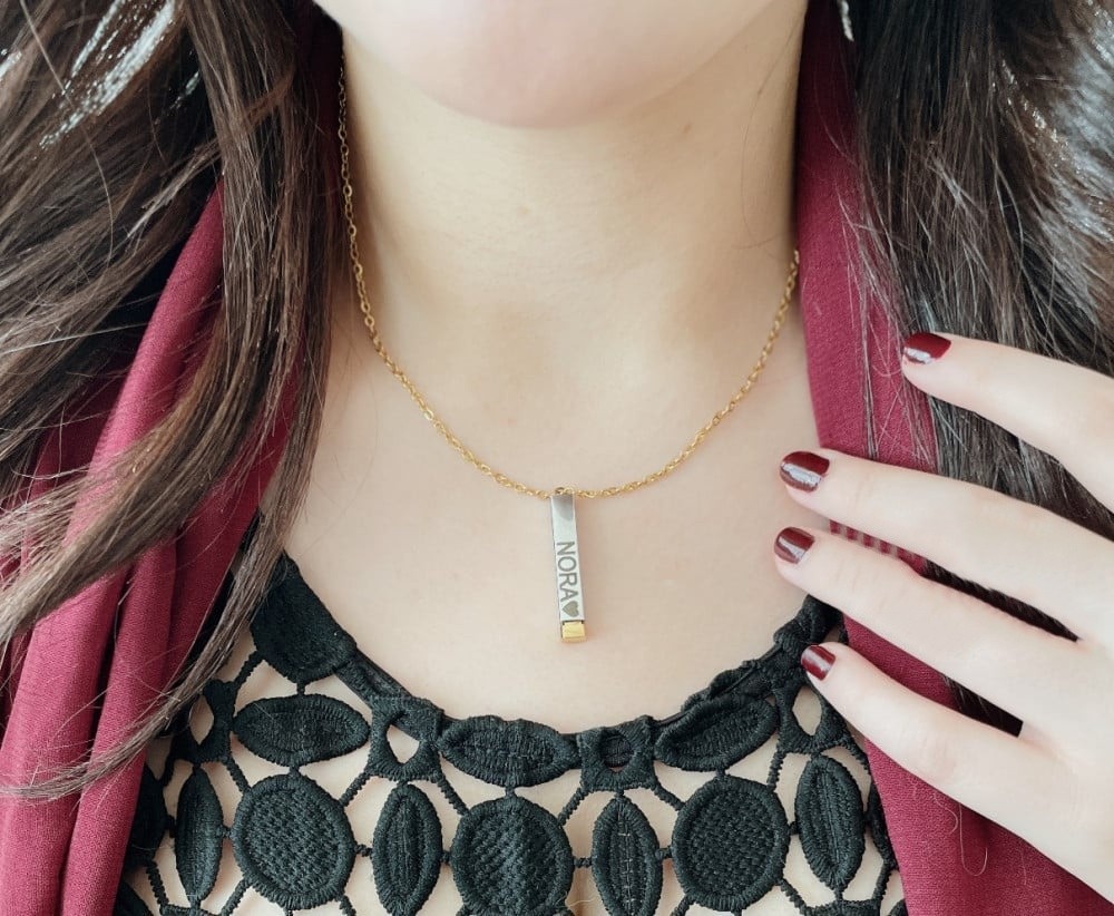 سلسال مميز جدا بتصميم الاسم مع الحرف بالعربي أو الإنكليزيي يمكن حتى طلب اسمين في السلسال واحد مطلي بطلاء ذهب عيار 21 مع ضمان سنتين على اللون بسمك 0.7 مم وطبعا مع علبة مخصصة وكيس