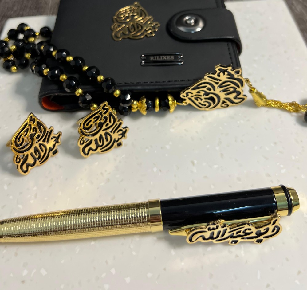 طقم رجالي بالاسم 5 قطع مكون من بوك رجالي ميداليه مفاتيح قلم كبك سبحة جميع القطع بالأسم