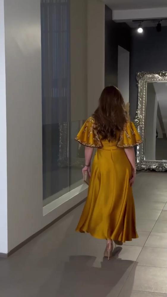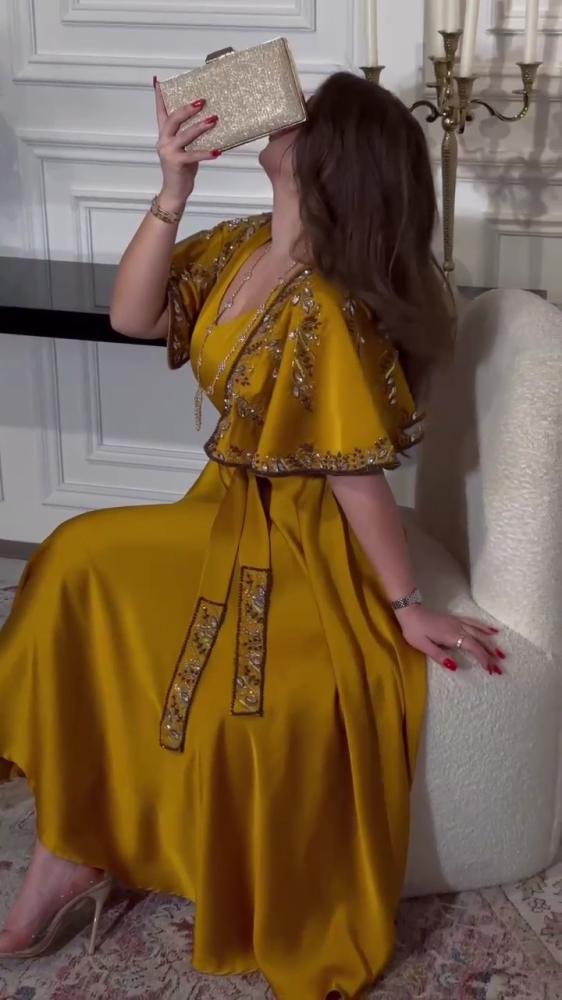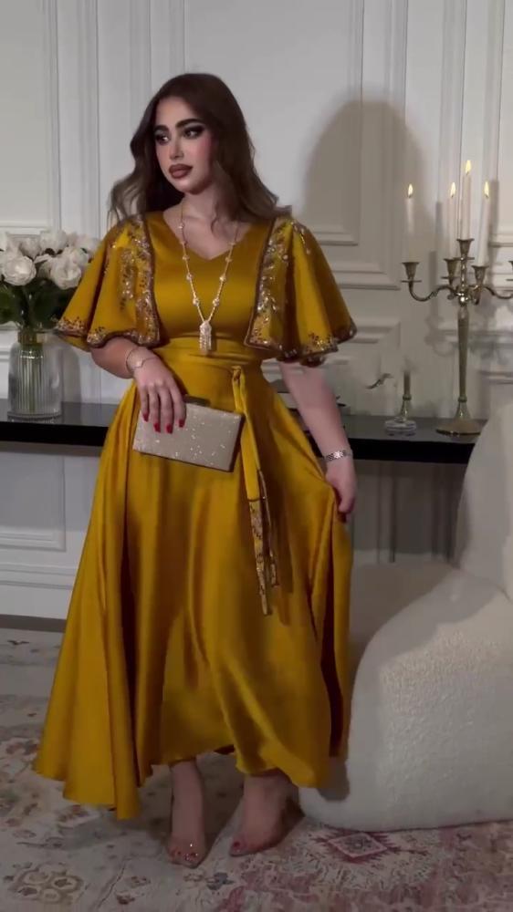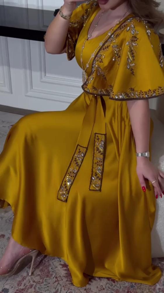 فستان نسائي كريب حرير لماع تطريز يدوي فصوص ولو