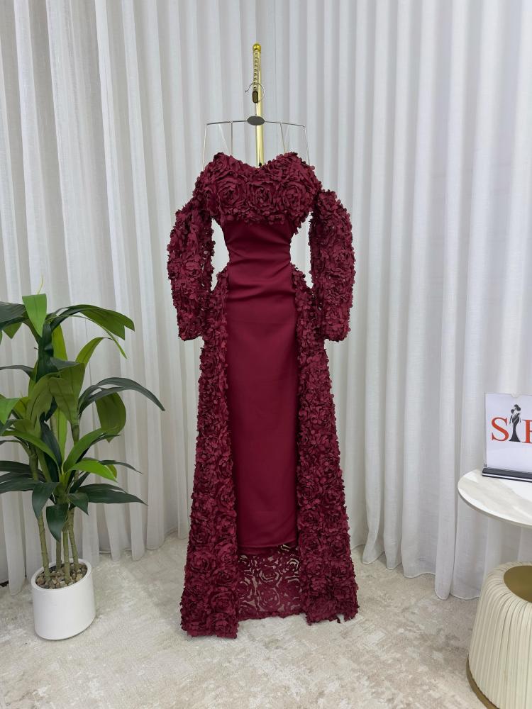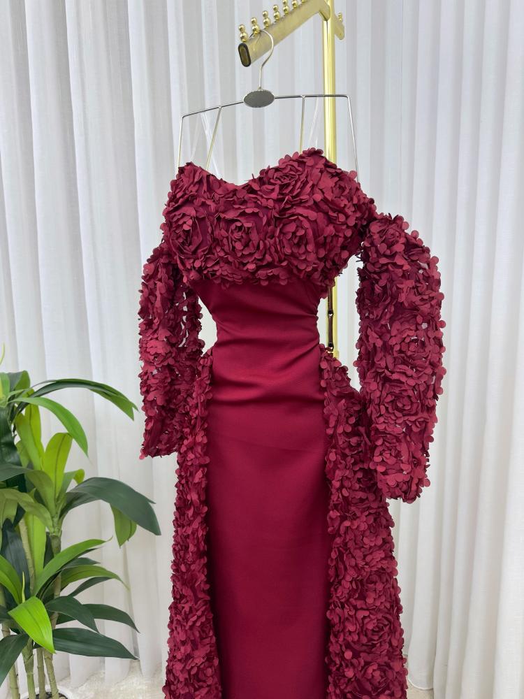 فستان سهرة احمر مع ورد