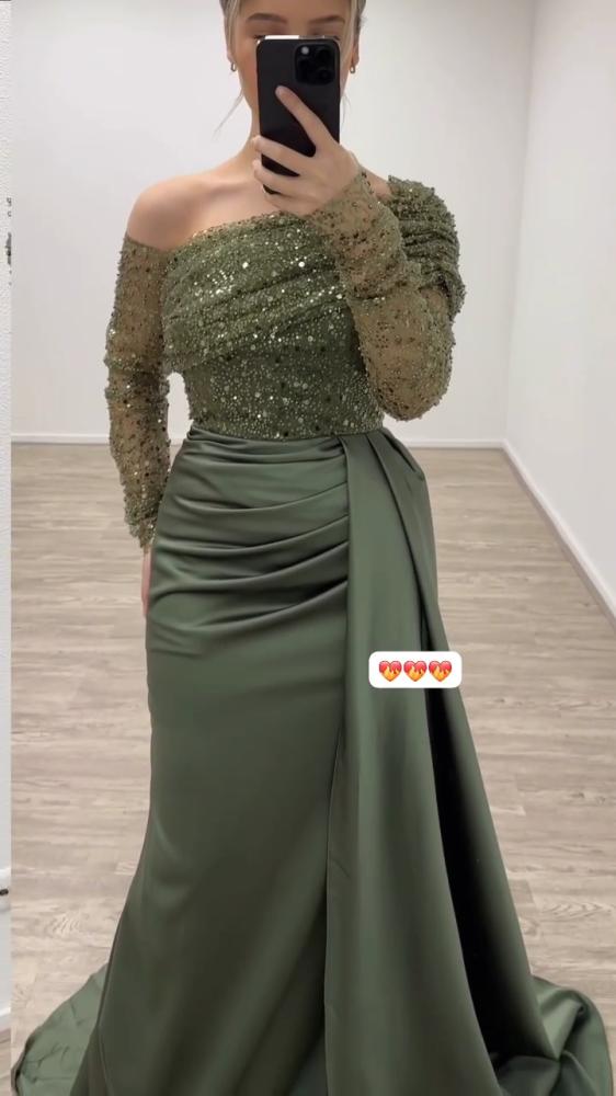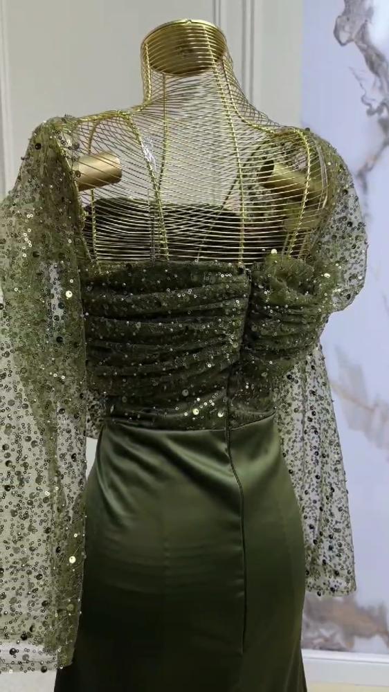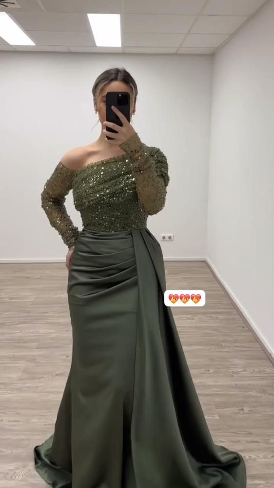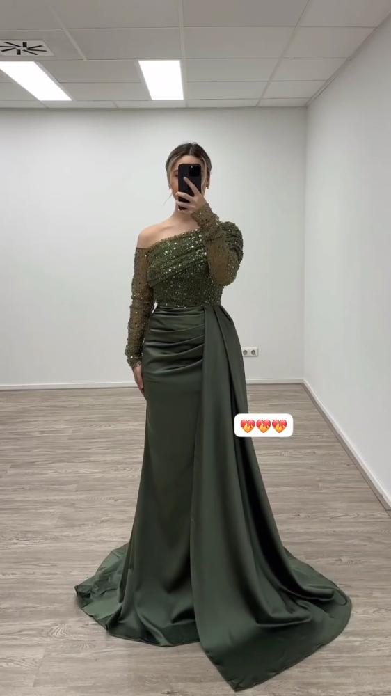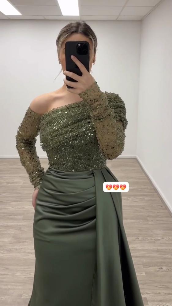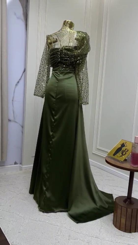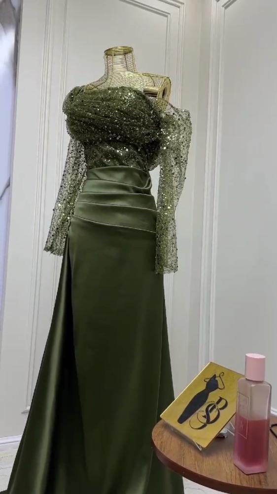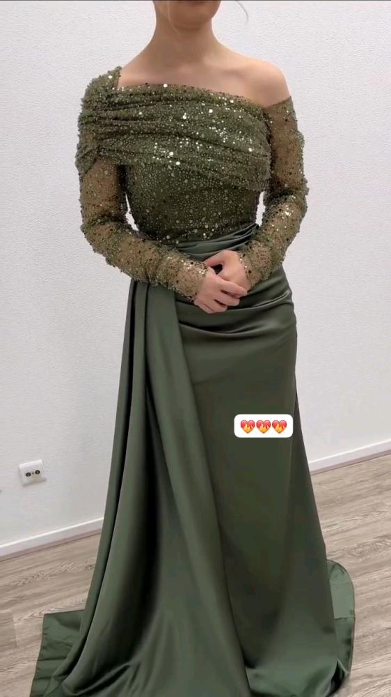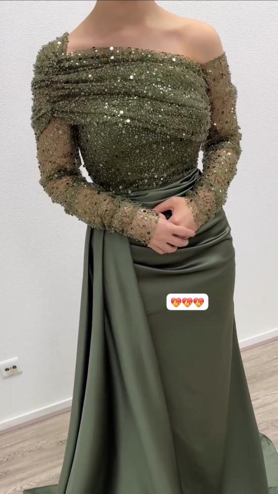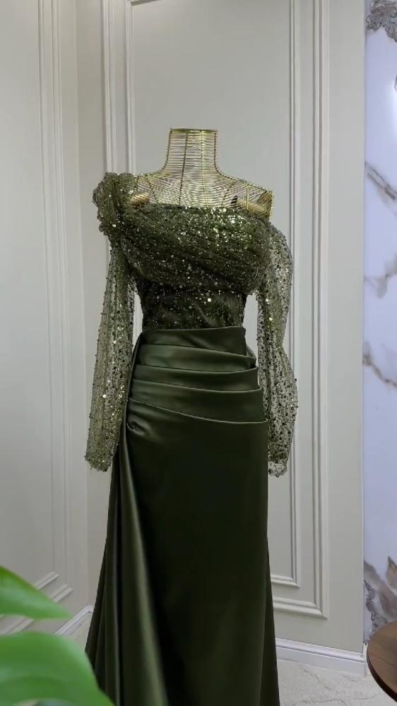 فستان نسائي زيتوني قماش تفته لماع مع ترتر