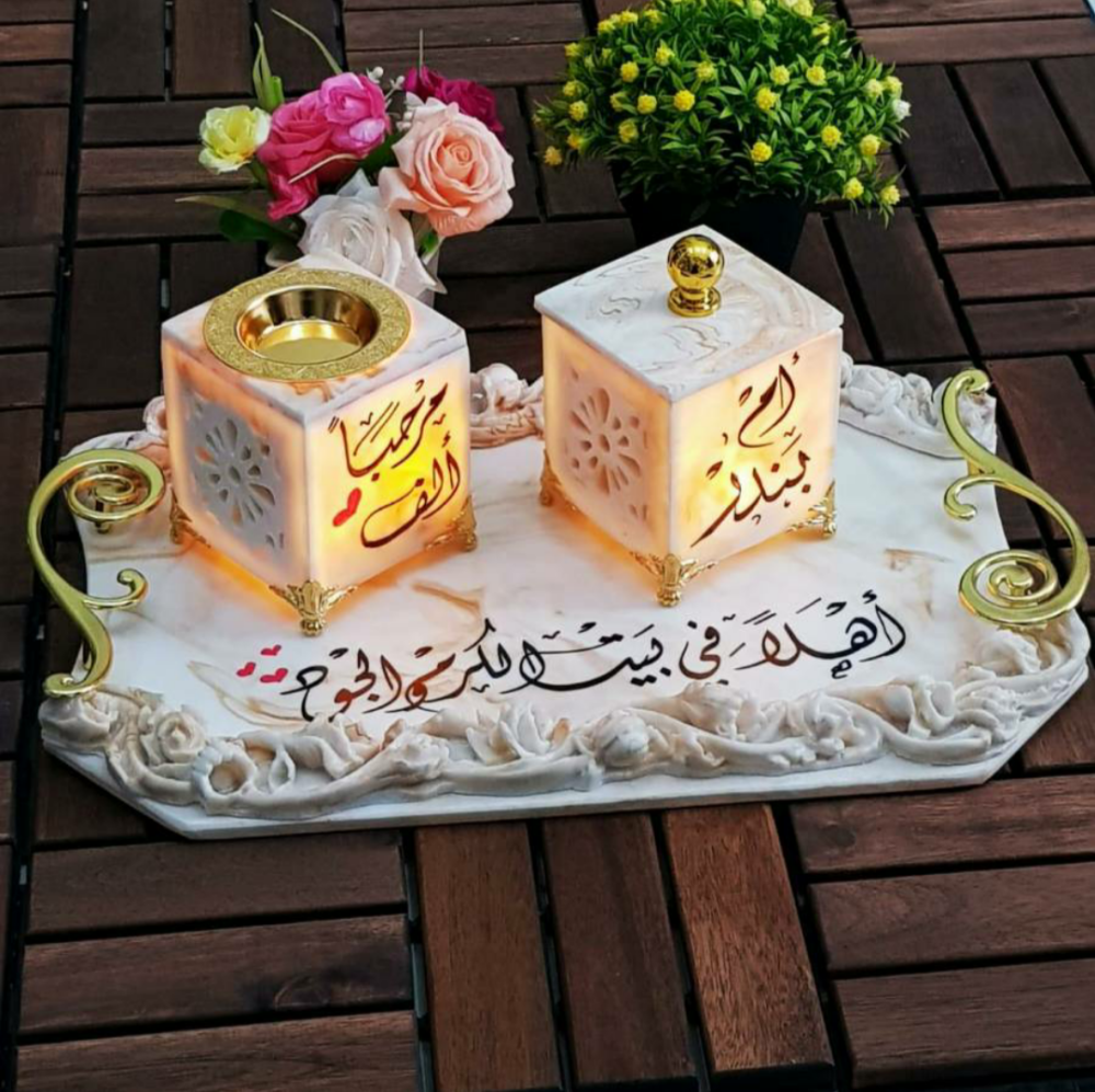 • يتكون الطقم من {مبخره بالاسم مع تعليقتها + بوكس العود + توله العطر + استاند خلفي بشكل سيفين ونخله + الصينيه الملكيه}