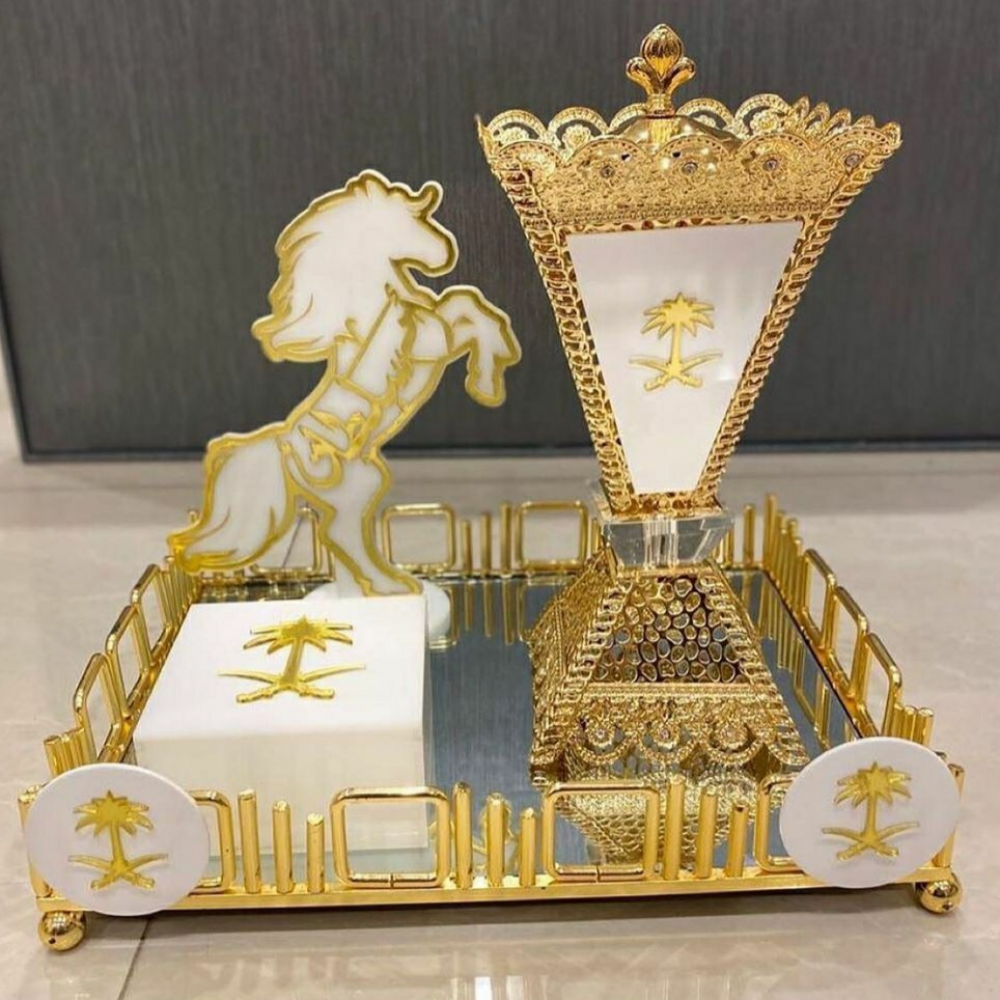 • يتكون الطقم من {مبخره بالاسم مع تعليقتها + بوكس العود + توله العطر + استاند خلفي بشكل سيفين ونخله + الصينيه الملكيه}