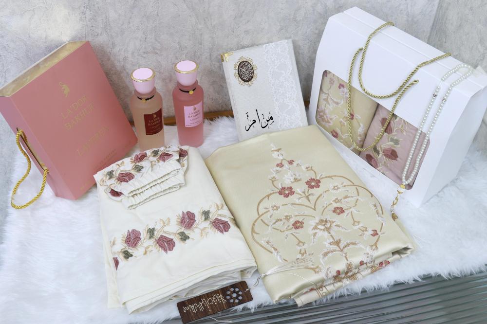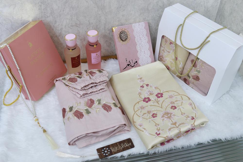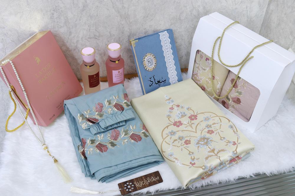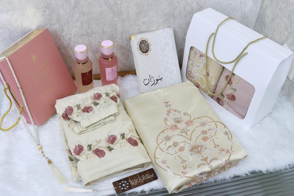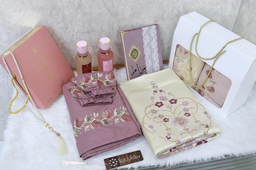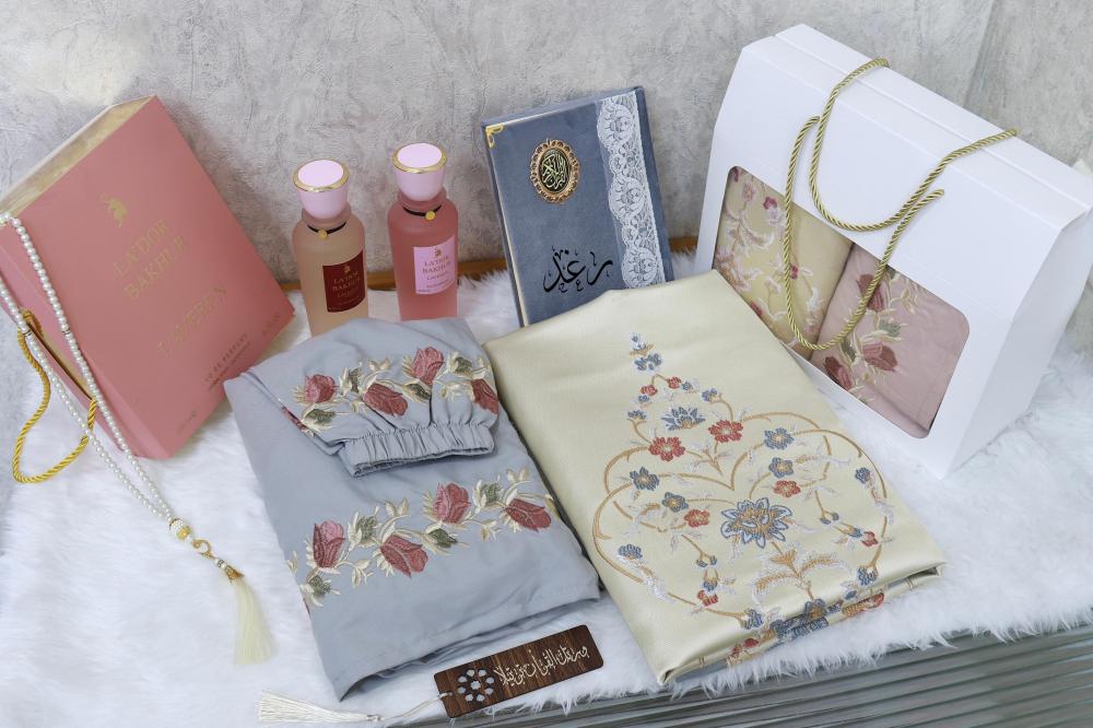 بكس صلاة مع سجادة ومصحف بالاسم مع مبخرة وسبحه وساعه رولكس مع تنسيق ورد