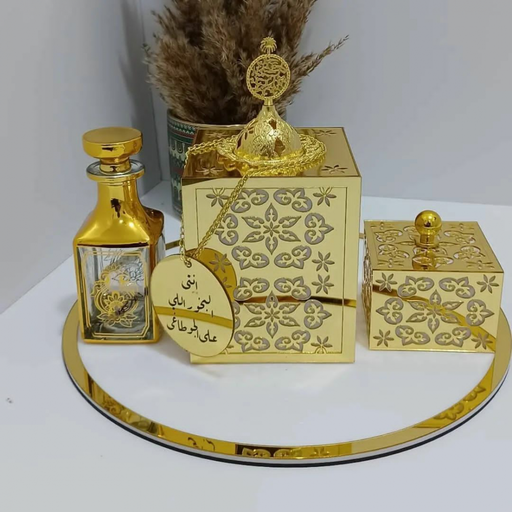 • يتكون الطقم من {مبخره بالاسم مع تعليقتها + بوكس العود + توله العطر + استاند خلفي بشكل سيفين ونخله + الصينيه الملكيه}