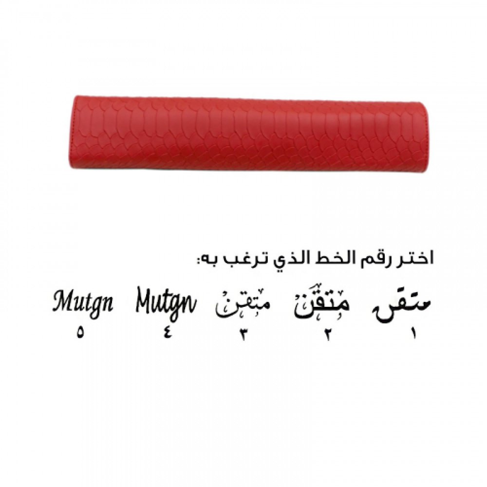 يمكنك أيضًا اختيار نوع الخط الذي تود أن تصمم به العبارة أو اسمك على التلبيسة والمسكة ، وفي أغلب الأحوال يتم تصميم العبارة أو الاسم بخط المشهور مثل ماهو موجود في الصور، ولكن يمكنك اختيار الخط الذي تريده بوضعه في صندوق نوع الخط بالأسفل.