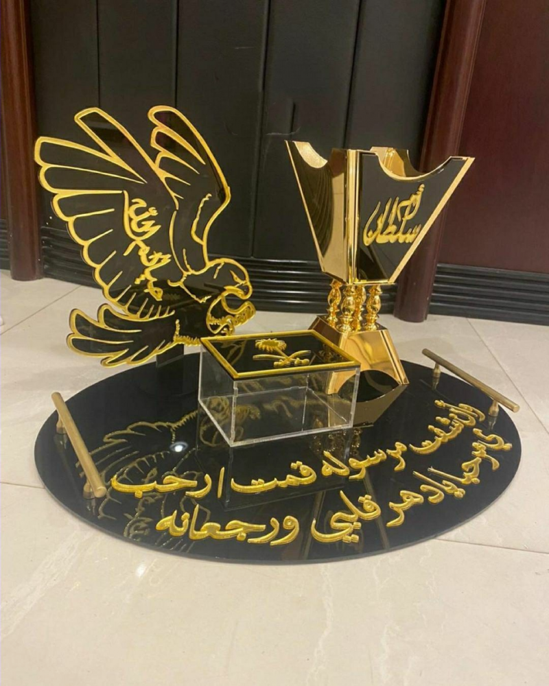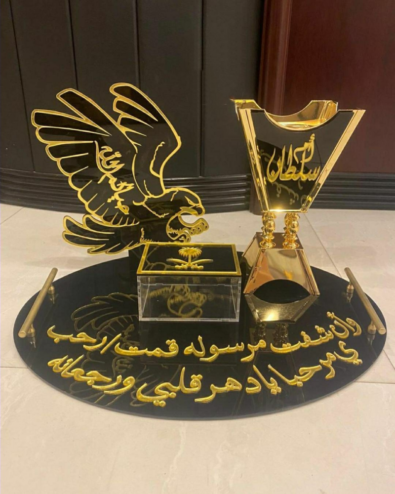 • يتكون الطقم من {مبخره بالاسم مع تعليقتها + بوكس العود + توله العطر + استاند خلفي بشكل سيفين ونخله + الصينيه الملكيه}