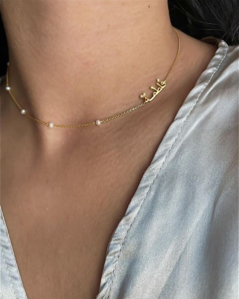 سلسال بتصميم الاسم مع شوكر الؤلؤ و الزركون حسب الطلب