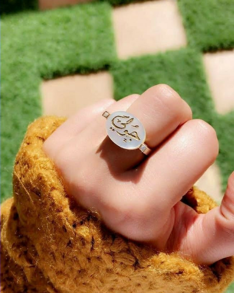 خاتم نسائي فضة خالص عيار 925 مع حجر صدفي مع زركون مع نحت الاسم