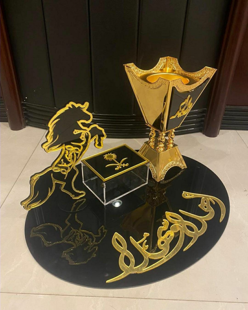 • يتكون الطقم من {مبخره بالاسم مع تعليقتها + بوكس العود + توله العطر + استاند خلفي بشكل سيفين ونخله + الصينيه الملكيه}