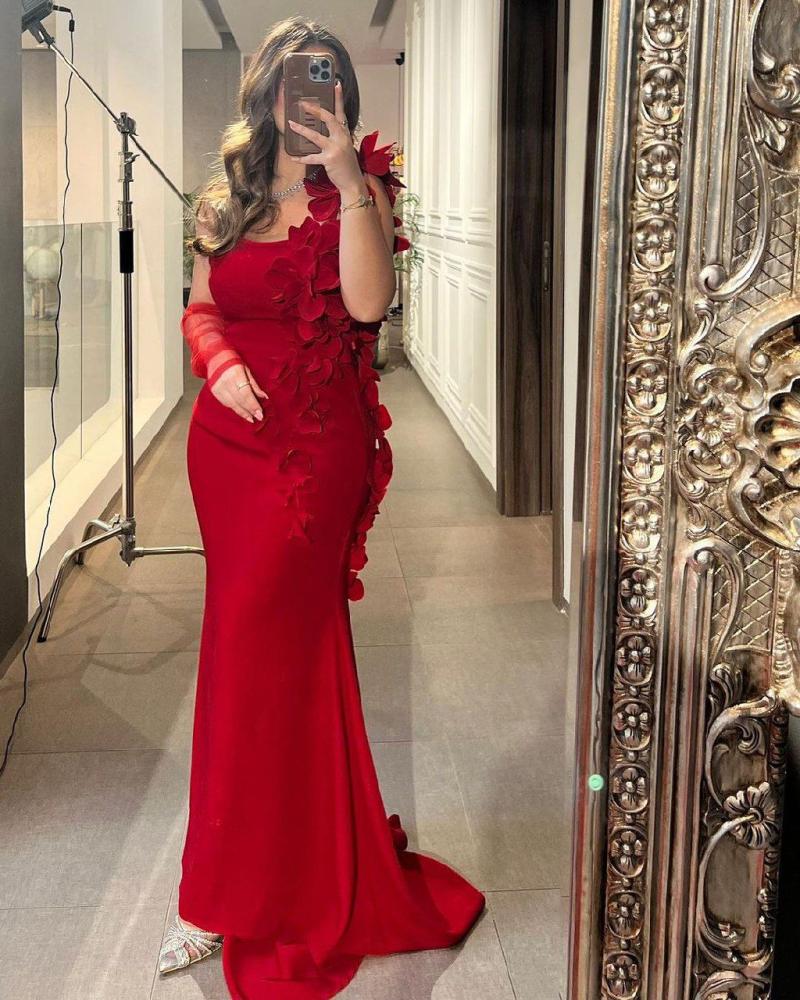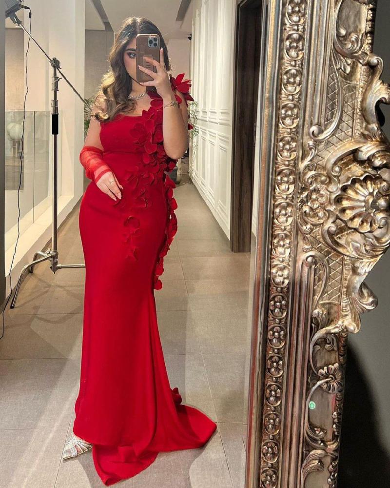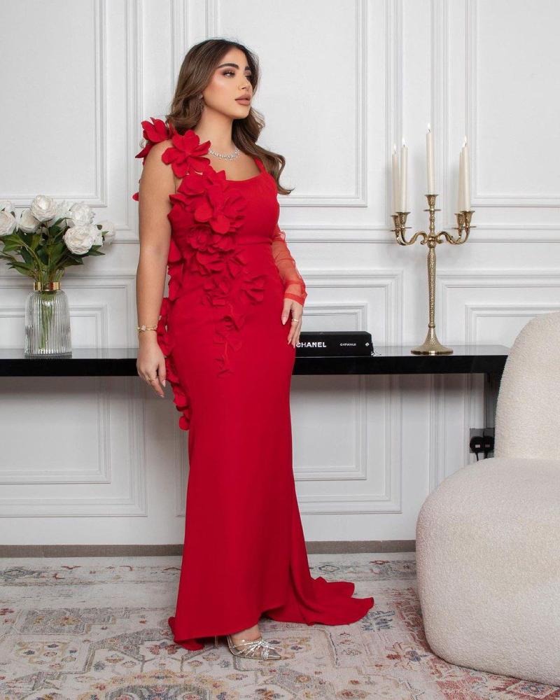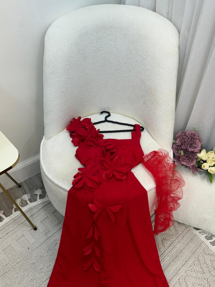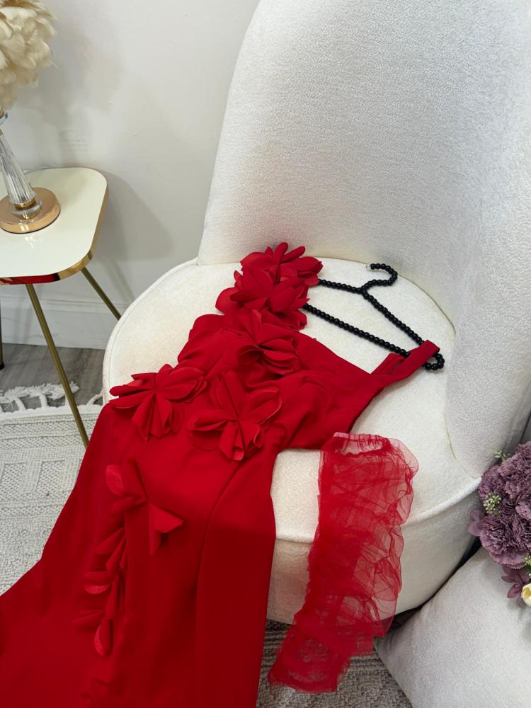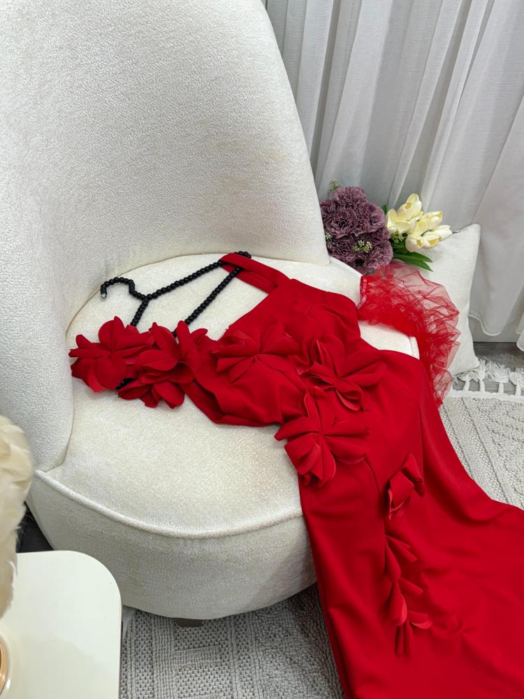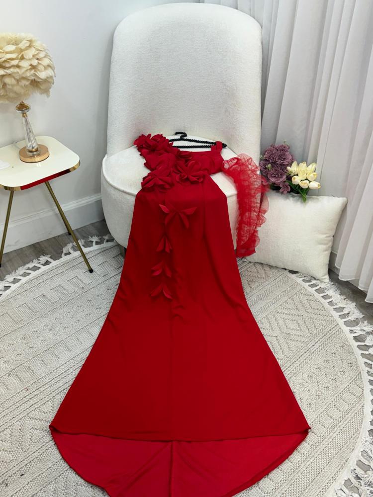 فستان سهرة نوع القماش _فستان نسائي احمرلكرا تطريز ورد تل