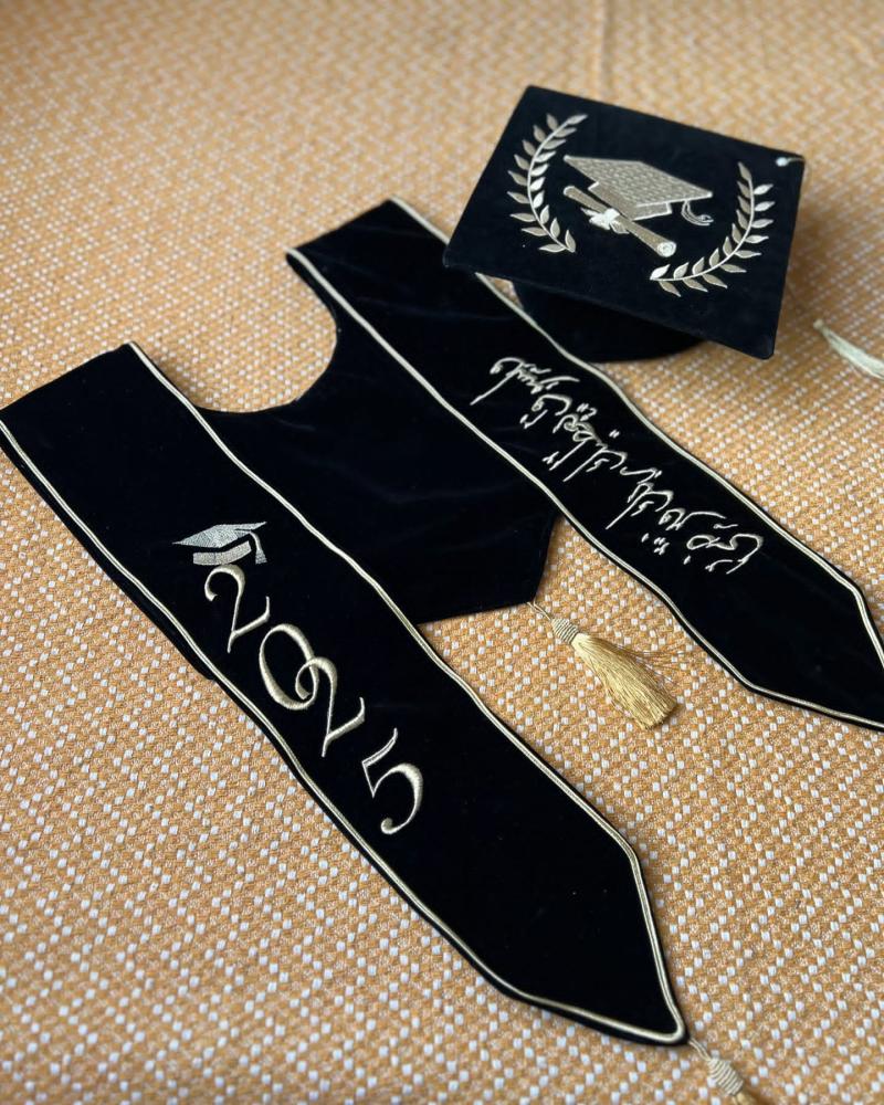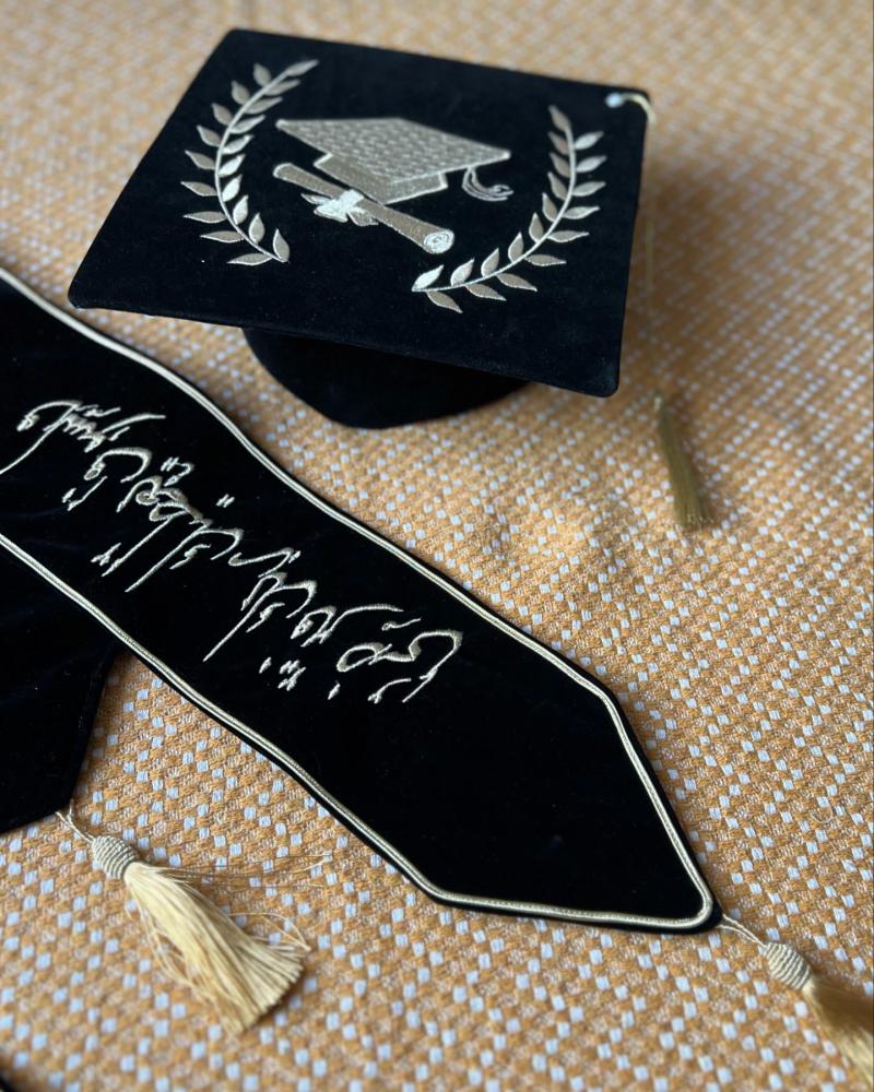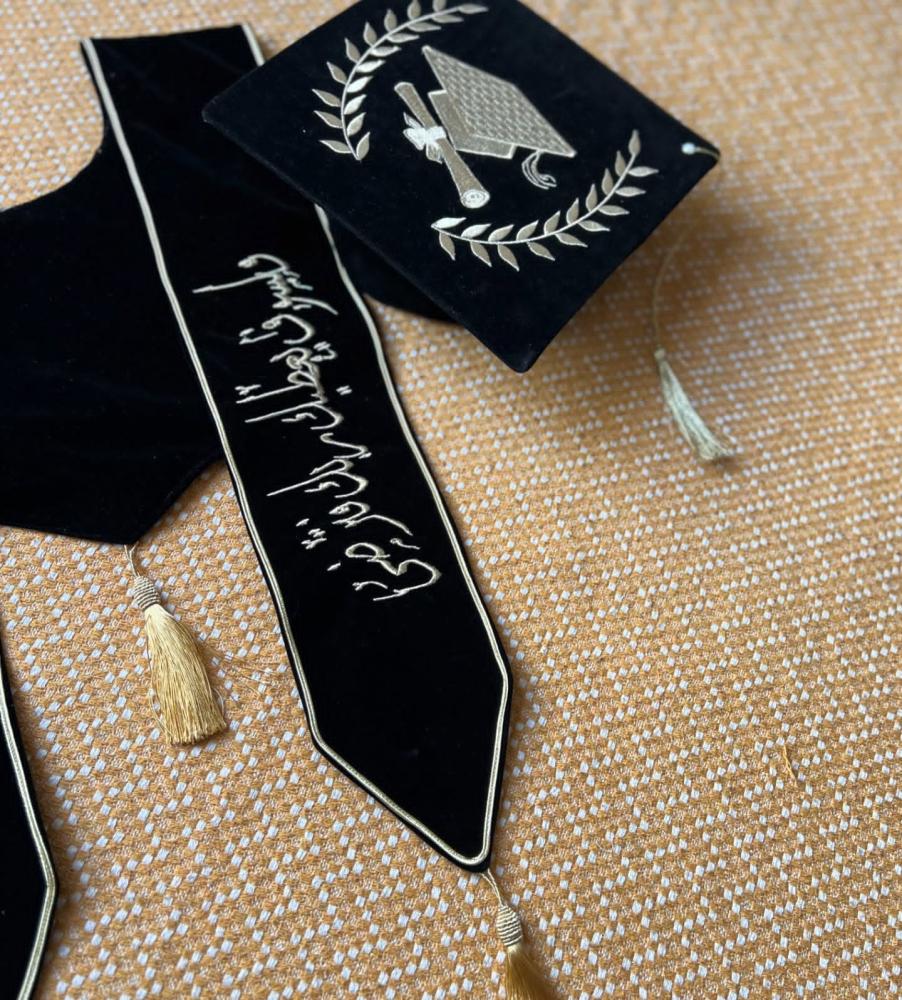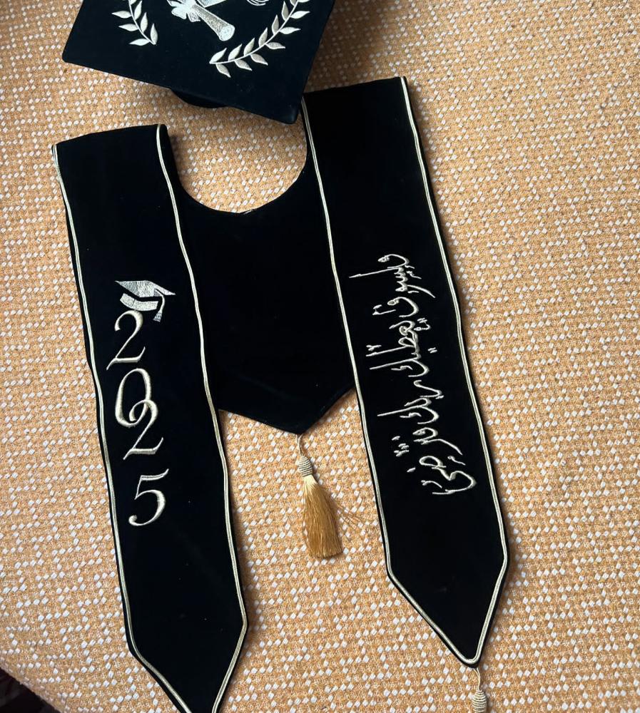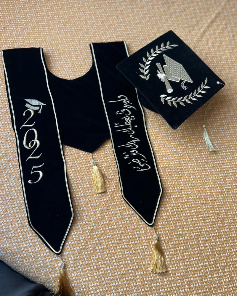 وشاح وقبعه تخرج مخمل او ستان بالاسم والعبارة وسنة التخرج وشعار الدفعة 2025