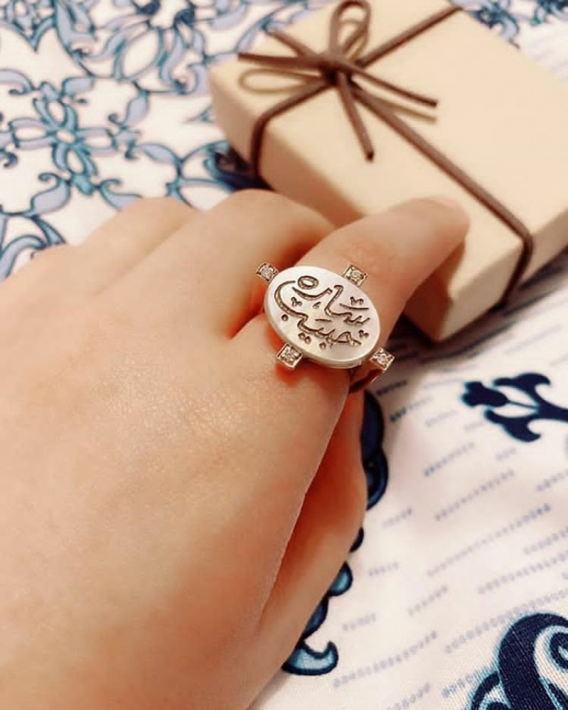 خاتم نسائي فضة خالص عيار 925 مع حجر صدفي مع زركون مع نحت الاسم