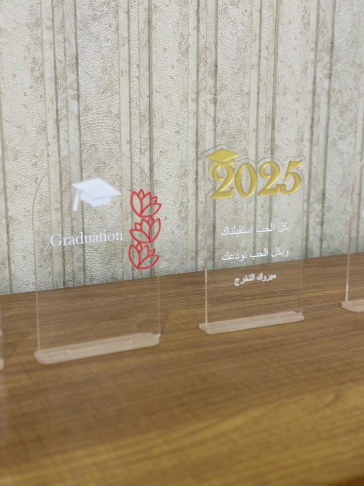 تصميم جديد وانيق للوحة بتصميم تخرج من الاكريلك وورق الفينيل الالماني المطبوع من الامام + ستاند من الاكريلك الشفاف بتصميم كلاسيكي ✨