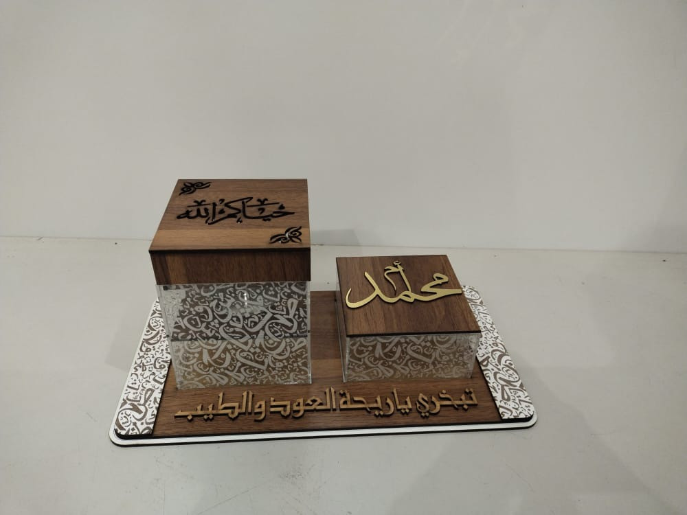 مبخرة وصينية خشب مع اكرليك بالاسم حسب الطلب