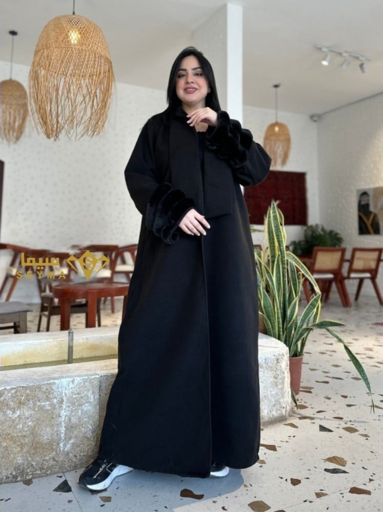 فروة شتوية مفتوحة صممت بطريقة عصرية ،منسوج من الجوخ ، اضيفت لها فرو المقلم الناعم في الاكمام ، اعطاها مظهر شتوي راقي وجميل ..