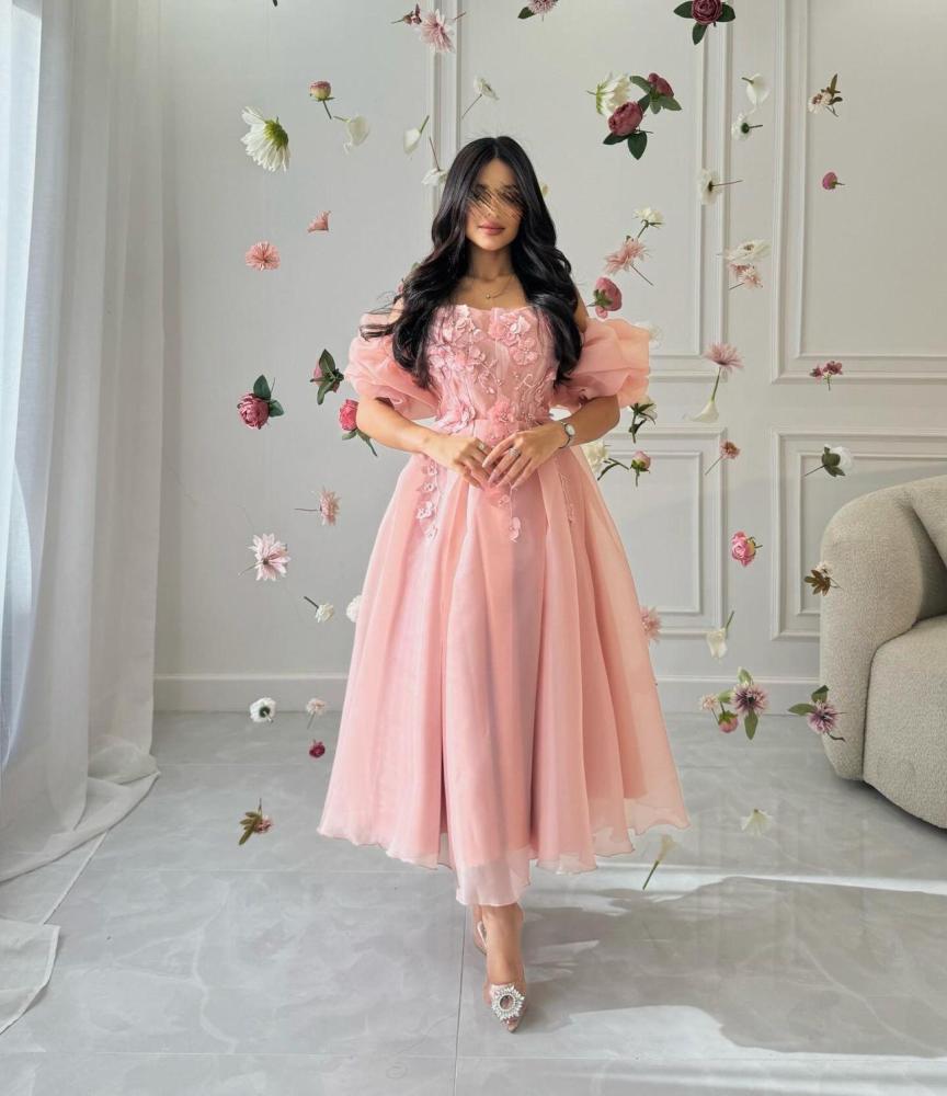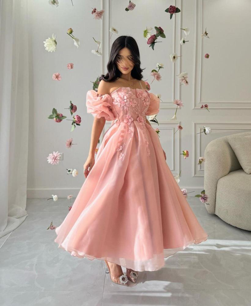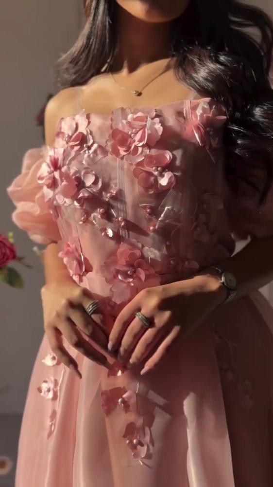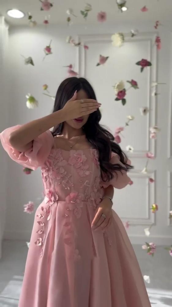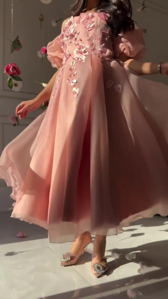فستان نسائي وردي خامة اورجنزا مع ورد