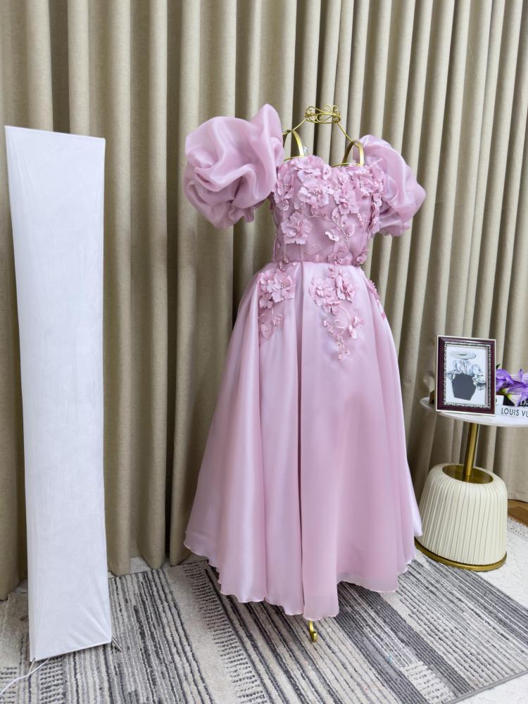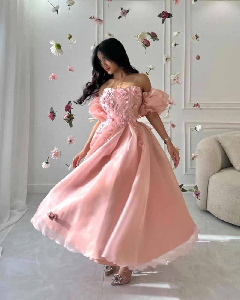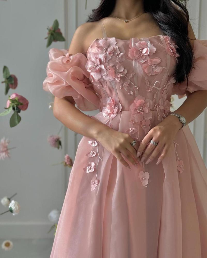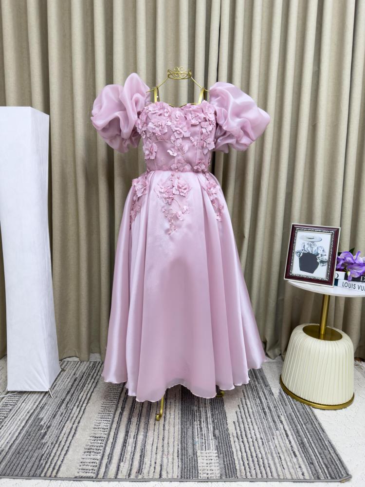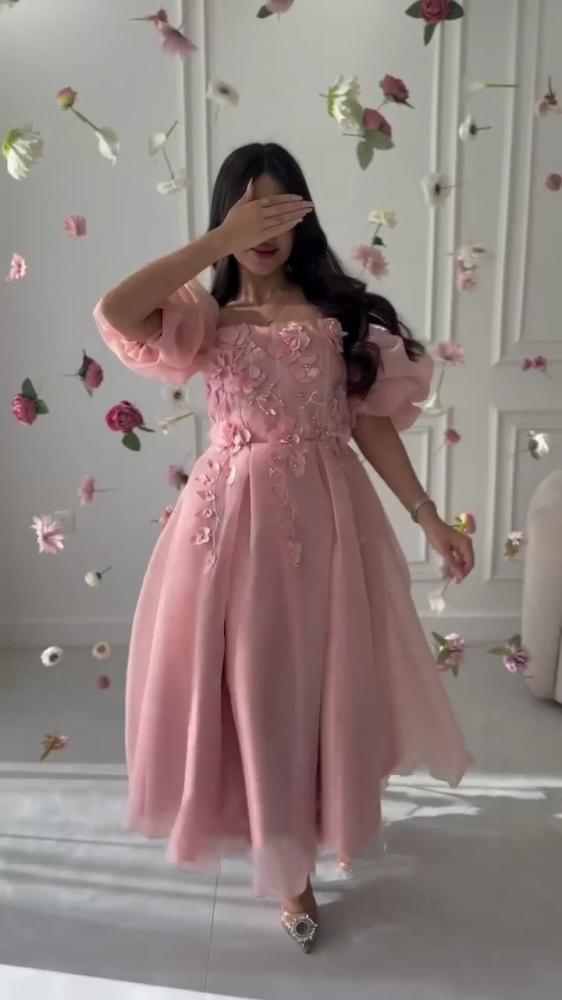 فستان نسائي وردي خامة اورجنزا مع ورد