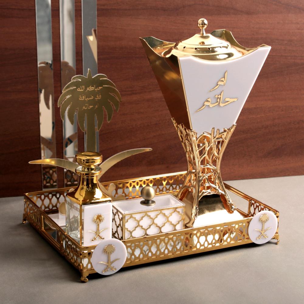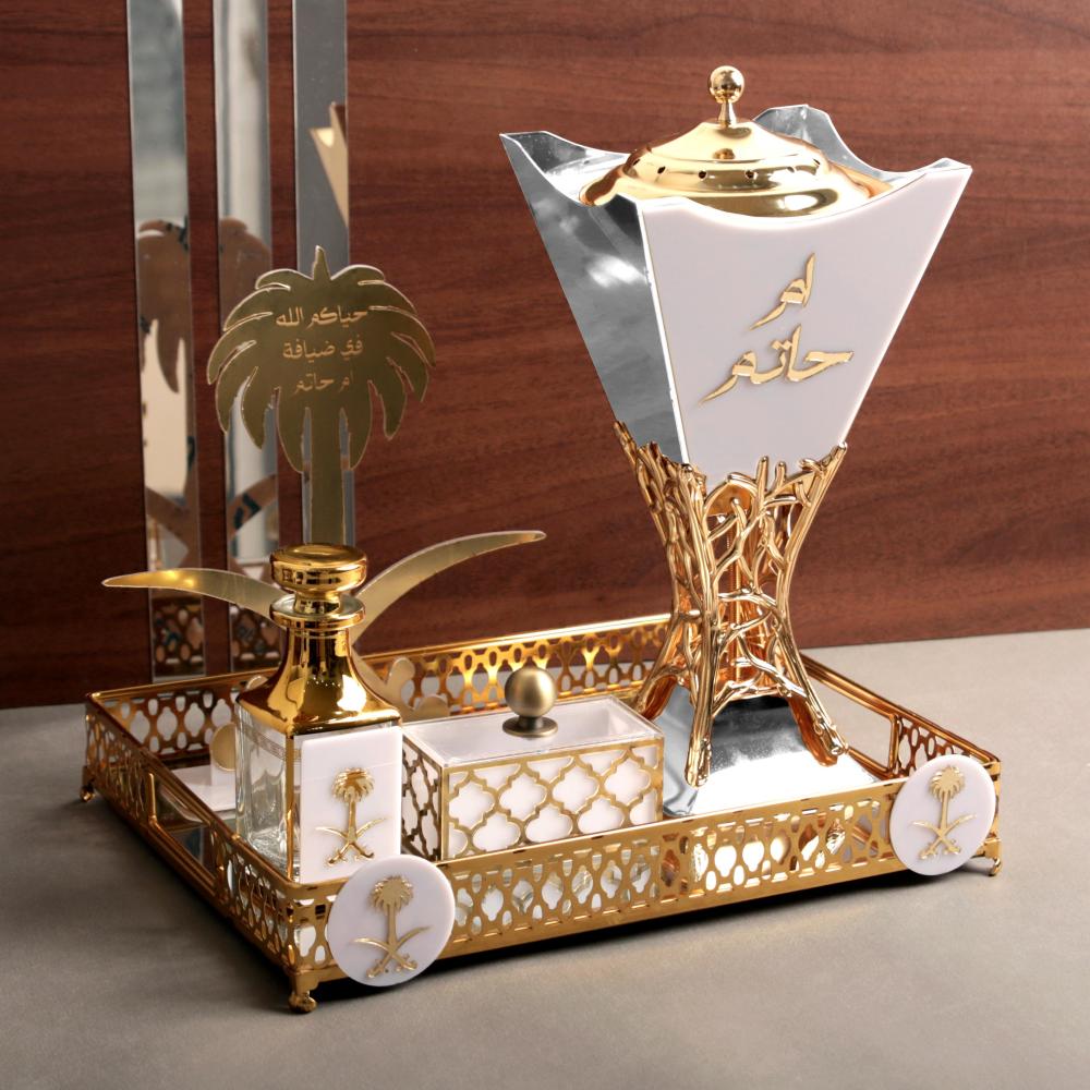 ١- مبخرة باللون الذهبي او الفضي ذهبي يتوسطها اكريلك ابيض بالاسم حسب الطلب