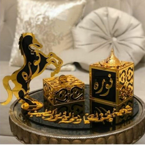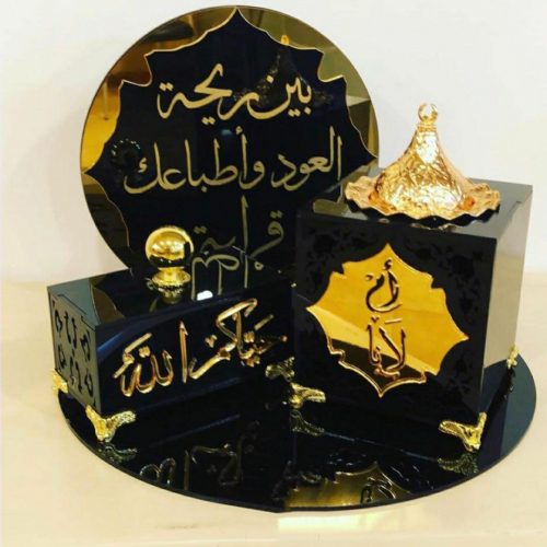 ١- مبخرة باللون الذهبي او الفضي ذهبي يتوسطها اكريلك ابيض بالاسم حسب الطلب