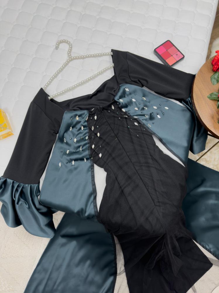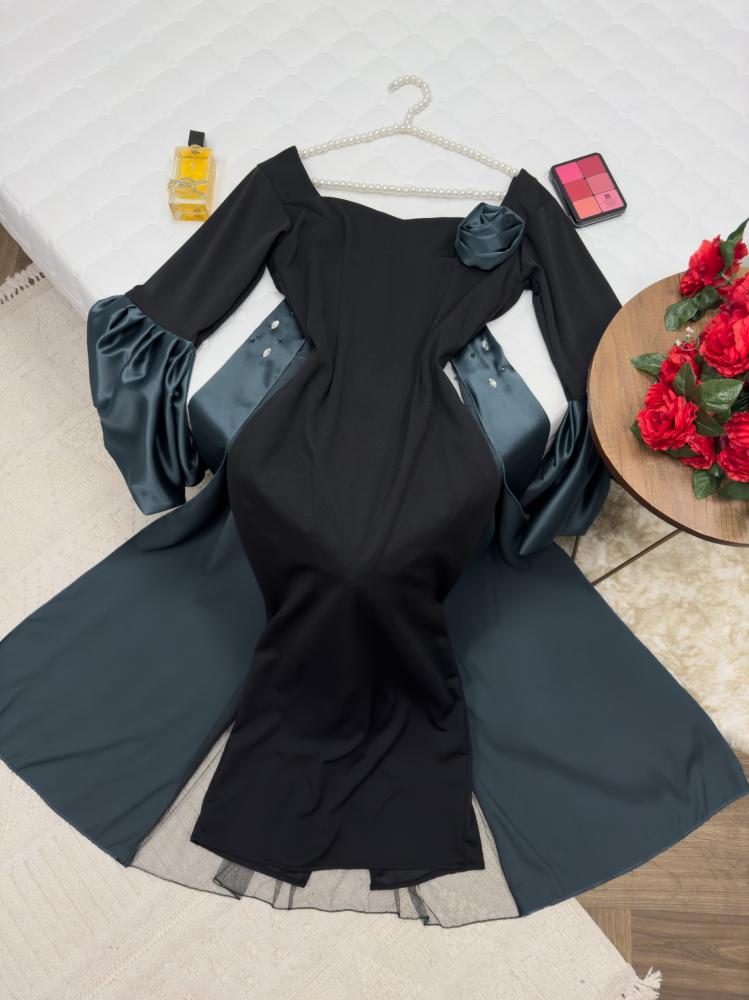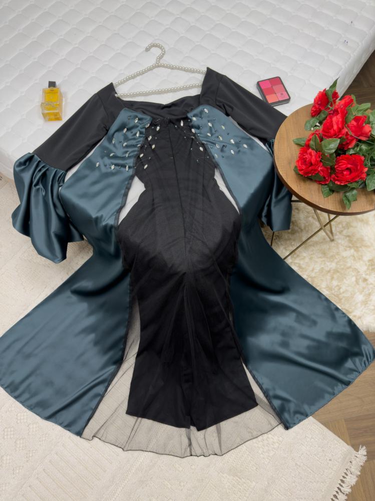 فستان نسائي دنانير خامه : كريب استرتش + تفته استرتش + تل + تطريز يدوي