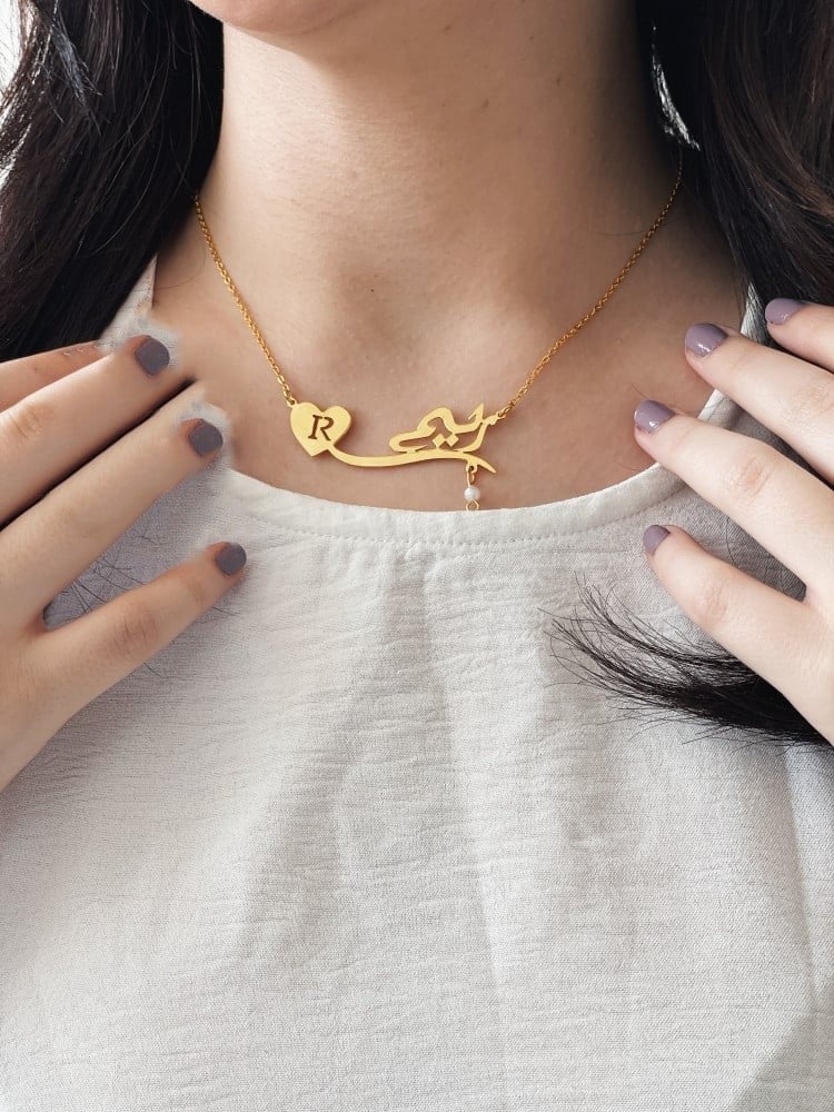 سلسال حرف مع قلب مع الاسم حسب الطلب.يمكنك كتابة الأحرف عربي او انجليزي.يتوفر اللونين:الذهبي.الفضي.ضمان سنتين على اللون.نصنعه باحتراف يدوياً وبشكل خاص لكل عميل.