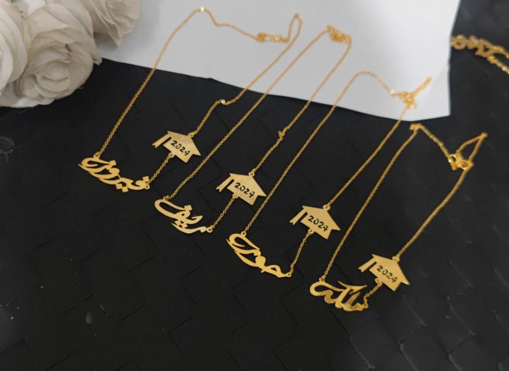 مطلي بالذهب عيار 21 قيراط.يمكنك تخصيص أي اسم أو كلمة (عربي أو إنجليزي).متوفر طلاء ذهبي أو فضي (روديوم).ضمان سنتين على اللون من لافيولا.سمك 0.7 مم.تأتي داخل علبة هدايا بسيطة وكيس عليها شعار لافيولا